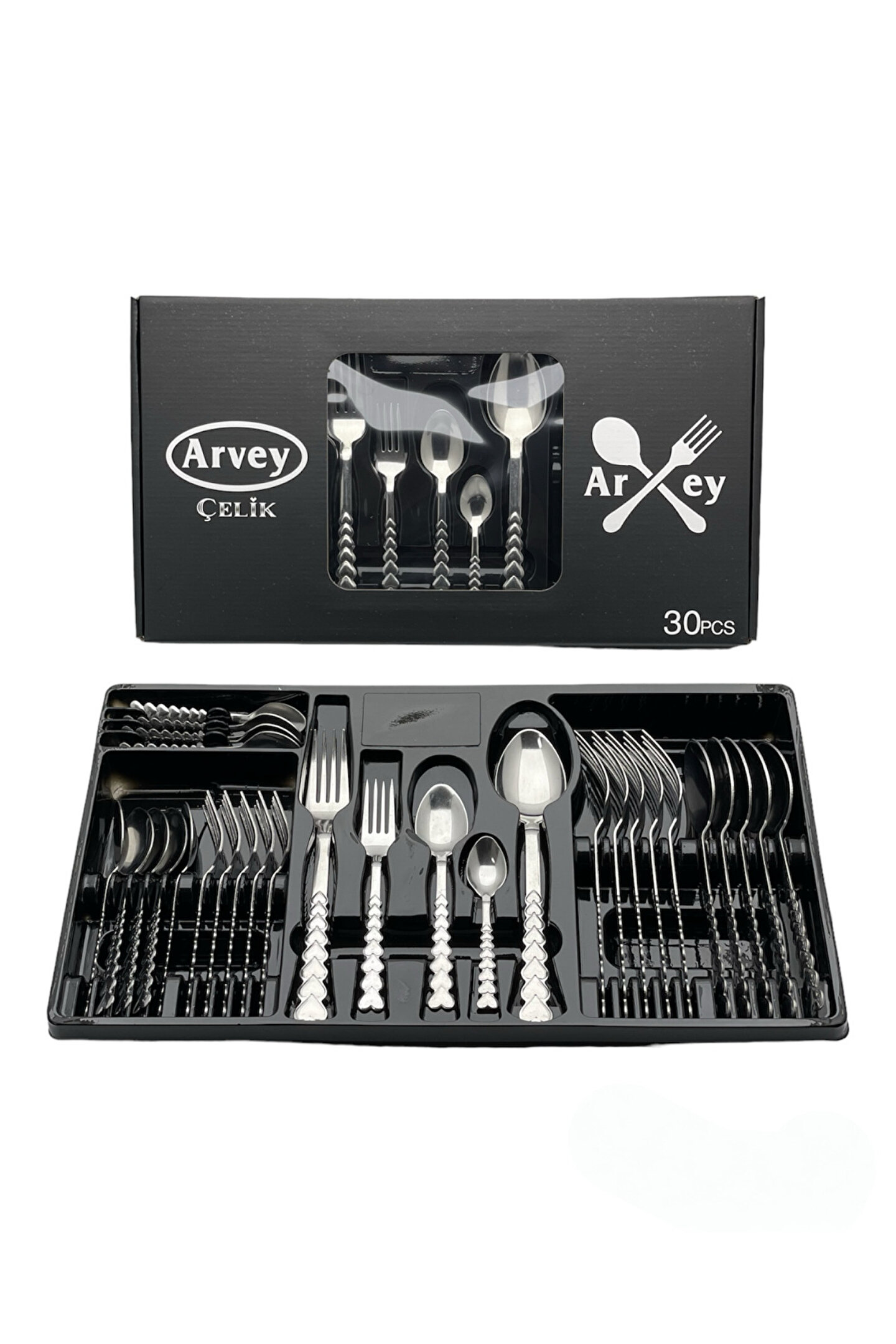 Arvey 30 Parça 6 Kişilik ; 6 Parça Yemek Çatalı ; 6 Parça Yemek Kaşığı ; 6 Parça Tatlı Çatalı ; 6 Parça Tatlı Kaşığı ; 6 Parça Çay Kaşığı ; Ürünleri kullanımdan önce sıcak suda sabun veya bulaşık deterjanı ile yıkadıktan sonra durulayıp bir bez ile iyice kurulayın ; Kesinlikle çamaşır suyu kullanmayınız, asitli ortamda bulundurmayınız ; Ürünleri kullanımdan sonra en kısa sürede yıkayınız ve kurulayınız ; Ürünler bulaşık makinasında yıkanabilir makindan çıktıktan sonra neminin bir kere bezle alınması lekelerin oluşmasını engeller ; Ürün fiyat performans ürünüdür, hem günlük kullanıma hem çeyizlik için hem de endüstriyel alanda kullanılabilir. ; Paslanmaz,kararmaz,bozulmaz. ;