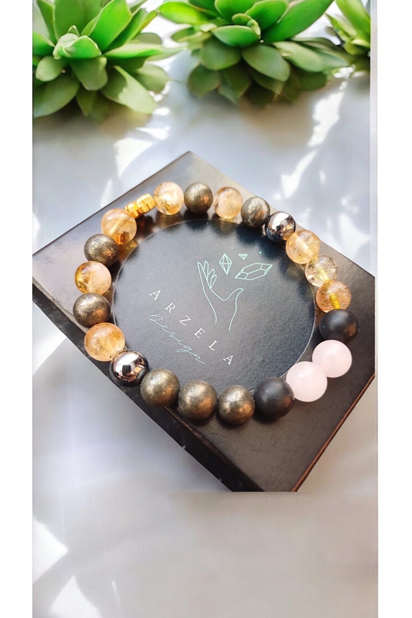 SİTRİNİN Bolluk bereket enerjisi Piritin para ve zenginliği çeken enerjisi ile birleşti İçine iki kalbi temsil eden AŞK TASI PEMBE KUVARS yerleşti ve kalpler Sungitle korumaya alindi Materyaller altın kaplamadır Kimyasal ile temas ettirmeyiniz Ürün kutu içerisinde yedek misina ile gönderilecektir