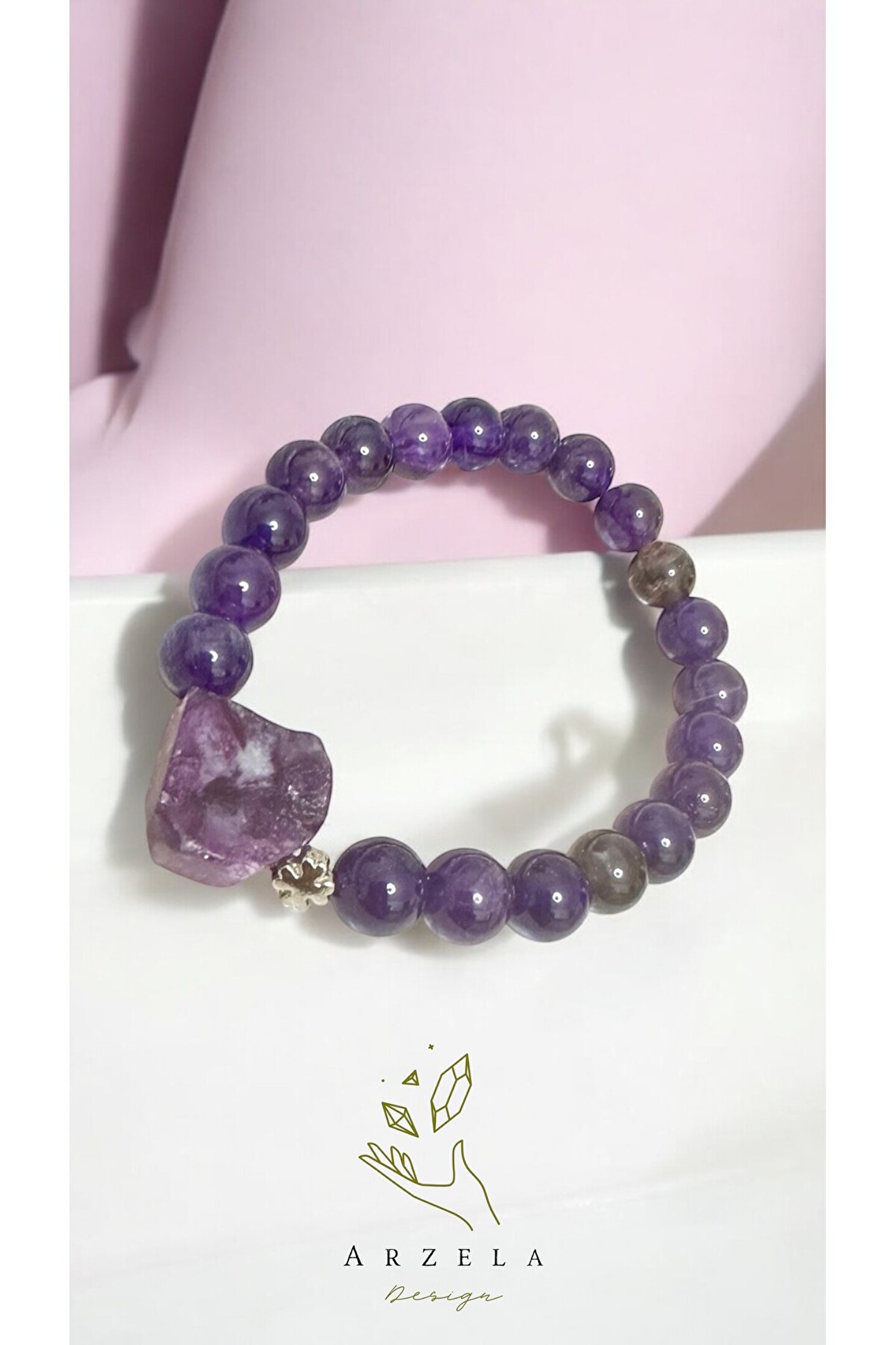 AMETİST TAŞI Kişiyi maddi ve manevi bağımlılıklardan arındırır.; Korkuya karşı etkili bir taştır.; İletişim ve bilgelikle ilişkilendirilir.; Bu yüzden özellikle iletişim gezegeni Merkür’ün retro dönemlerinde takı olarak takmak veya etrafta bulundurmak çok faydalıdır.; Stres ve negatif enerjiye karşı rahatlatıcı bir aura oluşturur.; Ametist taşı bulunduğu ortamdaki negatif enerjiyi çekerek pozitif enerjiye dönüştürür.; Psişik saldırılara karşı kalkan görevi görür.; Ruhsal farkındalığı uyandırır ve spiritüel gelişimi destekler.; Kişiyi alkol, sigara, uyuşturucu gibi bağımlılıklardan arındırarak zihinsel açıklık sağlar.; İletişim konularında çok güçlü etkileri olduğu için kişiyi destekler.; LEPİDOLİT TAŞI Rahatlatıcı etkiye sahip olan lepidolit taşı, karışık duyguları ve ani ruh hali değişimlerini dengeler.; Değişimi kabullenmeye teşvik eden taş, eski ve artık size hizmet etmeyen enerjilerden arınmanızı sağlar.; Dışarıdan gelen negatif enerjileri engelleyerek içsel huzurun korunmasına yardım eder.; Yüksek bilinçle bağlanmayı kolaylaştırır ve kişiyi kendini sevmesi için teşvik eder.; Ürün kutu içerisinde yedek misina ve yedek taşla birlikte gönderilecektir