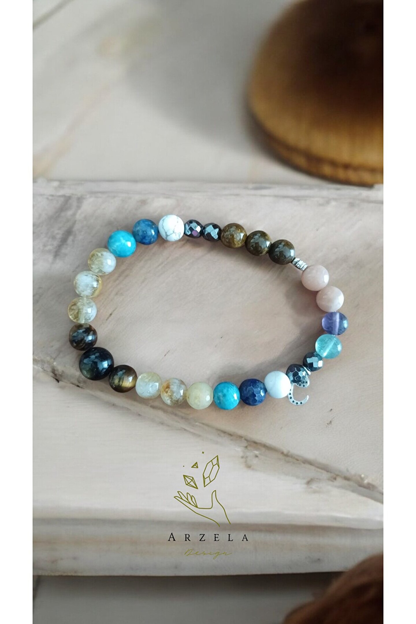 PEMBE KUVARS(İKİ GÖNÜL) ; KAPLAN GÖZÜ ; OBSİDYEN ; SITRIN ; FLORID ; APATIT ; HEMATİT ; GOLDEN HEALER ; HAVLIT taşları değerlerine göre bir araya getirilerek bedensel ve zihinsel denge ile sakinlik amaçlanmıştır ; Taşların özelliklerine bakınız Aparatlar gümüş kaplamadir Nem ve kimyasalla temas ettirmeyiniz Ürün kutu içerisinde yedek misina ve iki adet taşla birlikte gönderilecektir