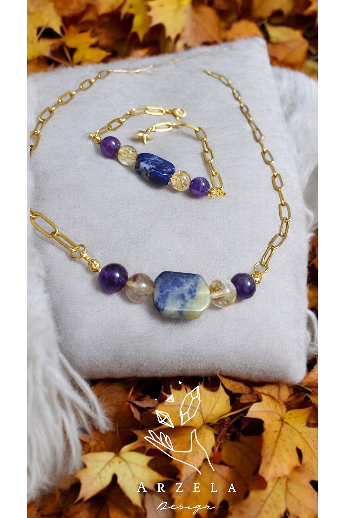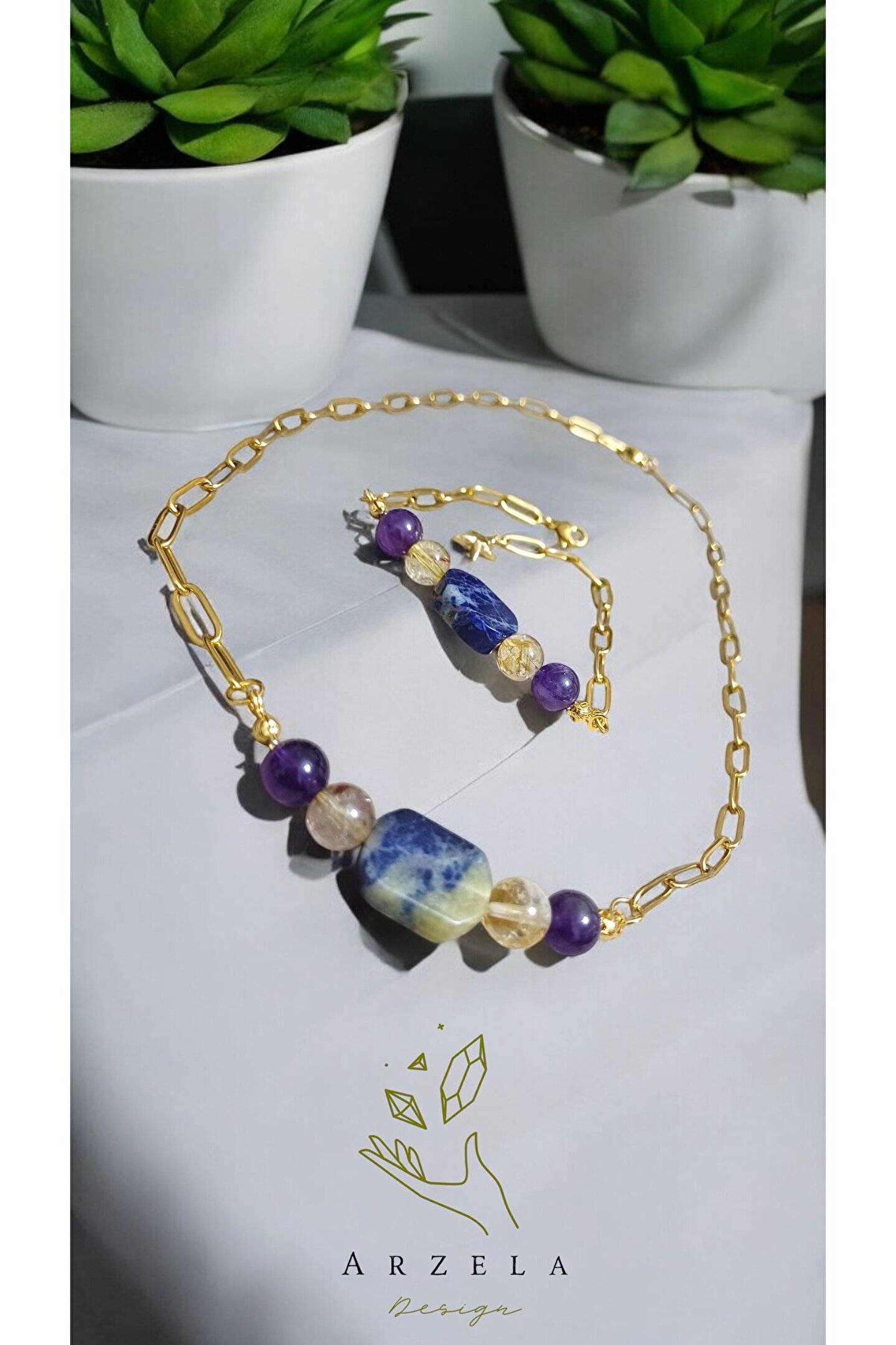 arzela Doğal Tas SODALIT AMETİST SITRIN KRİSTALLERİ ÇELİK ZİNCİR TAKI SETI