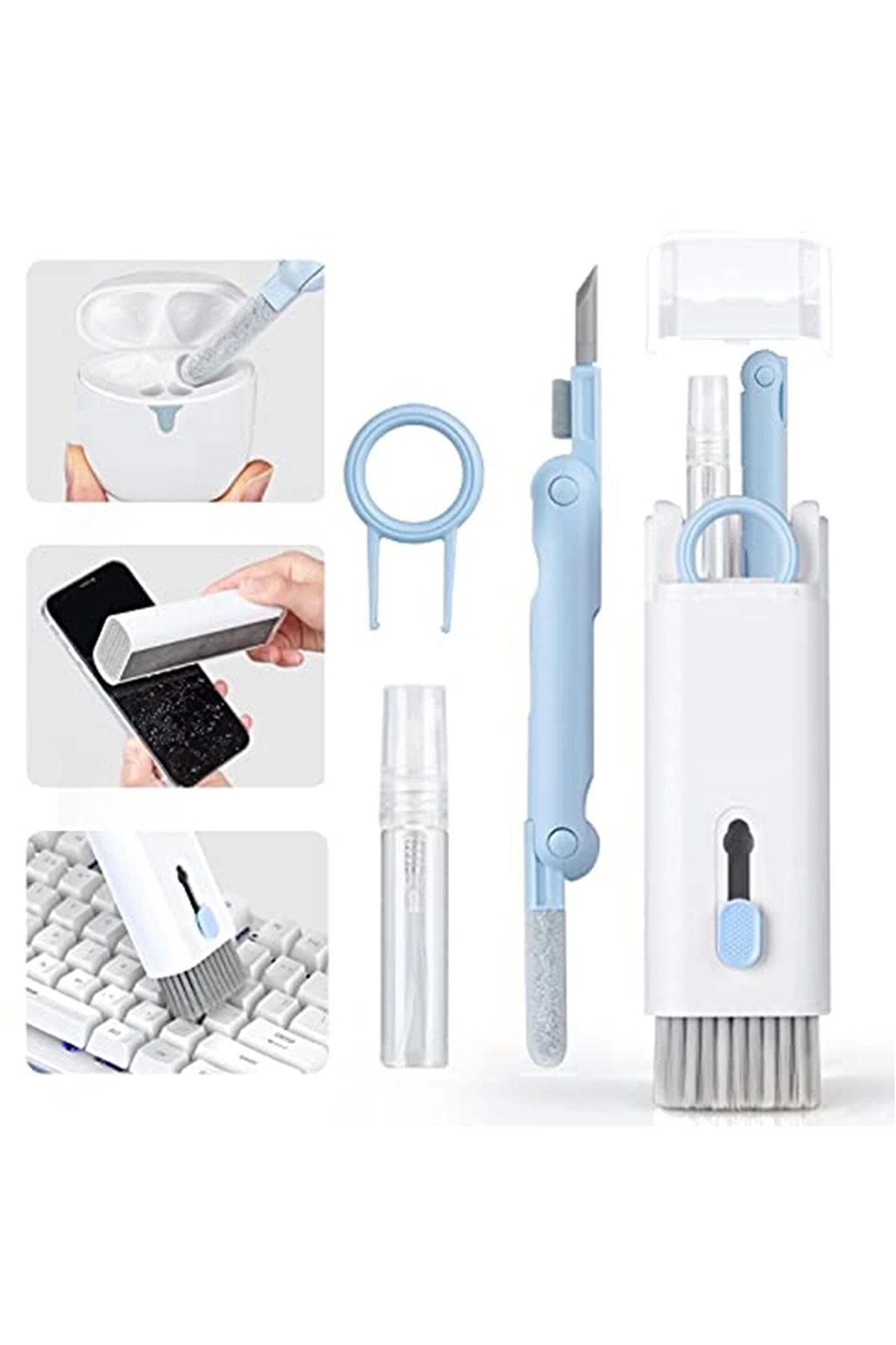 ?Çok fonksiyonlu temizleme fırçası?Klavye temizleme fırçası, çok fonksiyonlu kulaklık temizleyicisi, cep telefonları, oyun klavyeleri, kulaklık, dizüstü bilgisayar ekranları, kameralar, dijital saatler, işitme cihazları, teleskop ve diğer elektronik ve optik cihazlar için uygundur.; ?2022 yılının özel temizlik aracı?7'si 1 arada çok fonksiyonlu temizleme aleti seti, elektronik cihazlar için temizlik aleti, kapsamlı fonksiyonlar, mekanik klavyeler için tuş sökme aparatı, katlanabilir temizleme kalemi, temizleme şişesi, naylon fırça, flanel sünger.; Her zaman sahip olmak istediğiniz, küçük hepsi bir arada temizleme cihazı! Elektronik temizliği için uygundur ve çok çeşitli temizlik ihtiyaçlarını karşılar.; ?Tekrar kullanılabilir? Yeni elektronik cihazlarınızın bakımını düzenli olarak yaparak, kullanım ömürlerini uzatabilirsiniz.; ? Katlanabilir temizleme kalemi, silikon uç, bölme ve aralıklardaki kirleri gidermek içindir.; ?Tuş sökme aparatı mekanik oyun klavyeleri için kullanılabilir, fırça ise klavyenin içindeki kirleri iyice temizlemek için.; ? Parmak izi, yağ lekeleri ve toz için arka tarafındaki parlatma başlığını kullanın.; ?Kompakt ve saklaması kolay? Temizleme seti kare şeklinde ve avuç içi boyutundadır, böylece her zaman, her yerde yanınızda taşıyabilirsiniz.; Saklama kutusu kolay düzenleme sağlar.; ?En iyi hediye?Temizleme seti ile artık yıllar içinde toz biriken küçük şeylere müdahale edilebilir; bu eşyalar artık iyice temizlenebilir.; Cihazlarınıza yeni bir görünüm kazandıracak ve aynı zamanda sizi mutlu edecek harika bir buluş.; Arkadaşlarınız, aileniz ve iş arkadaşlarınız için hediye olarak da düşünebilir ve böylece mutluluğunuzu onlarla paylaşabilirsiniz.;