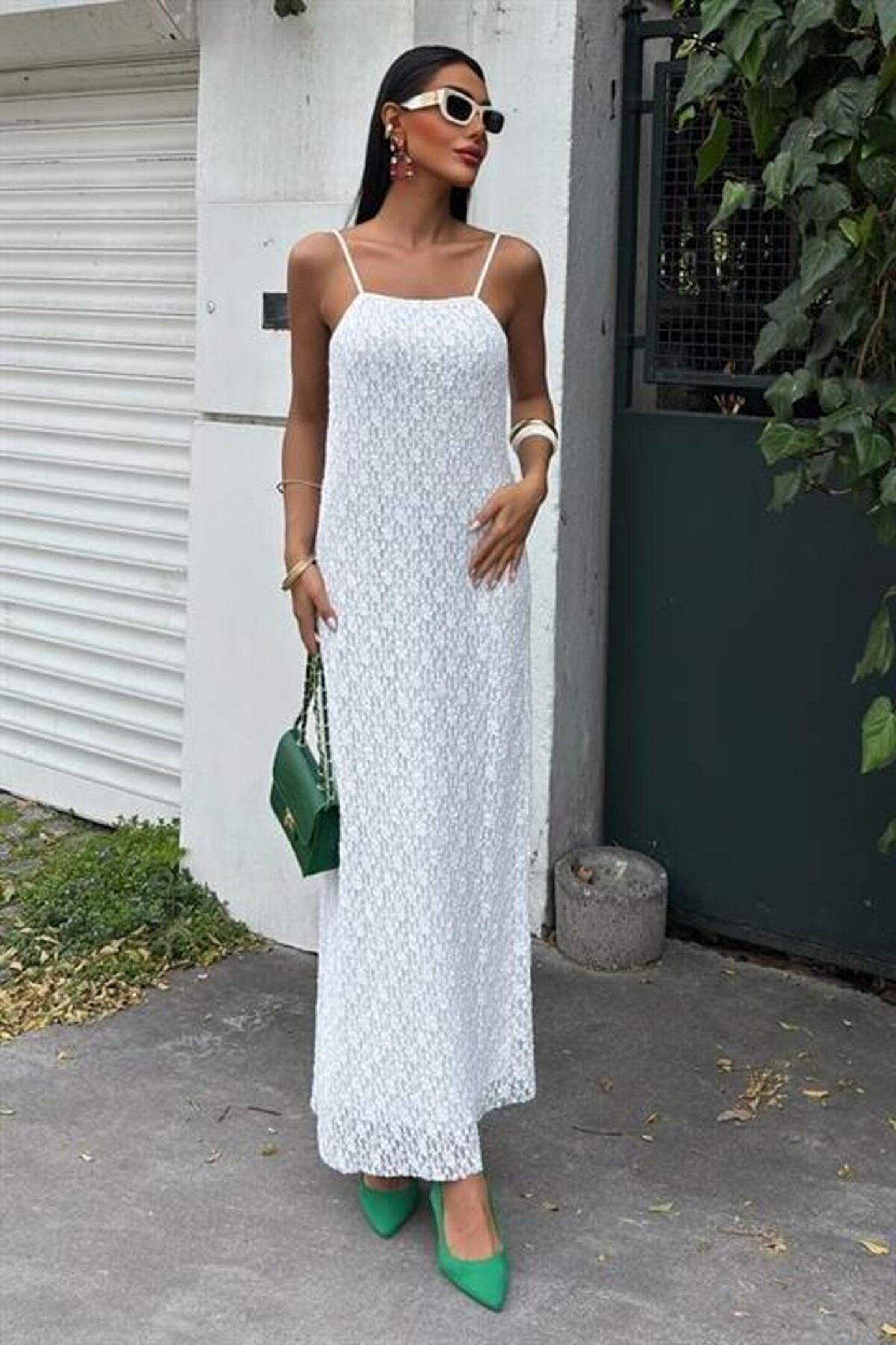 MDB Kadın Ip Askılı V Yakalı Bel Güpür çiçek Desenli Yandan Yırtmaçlı Maksi Süprem Elbise