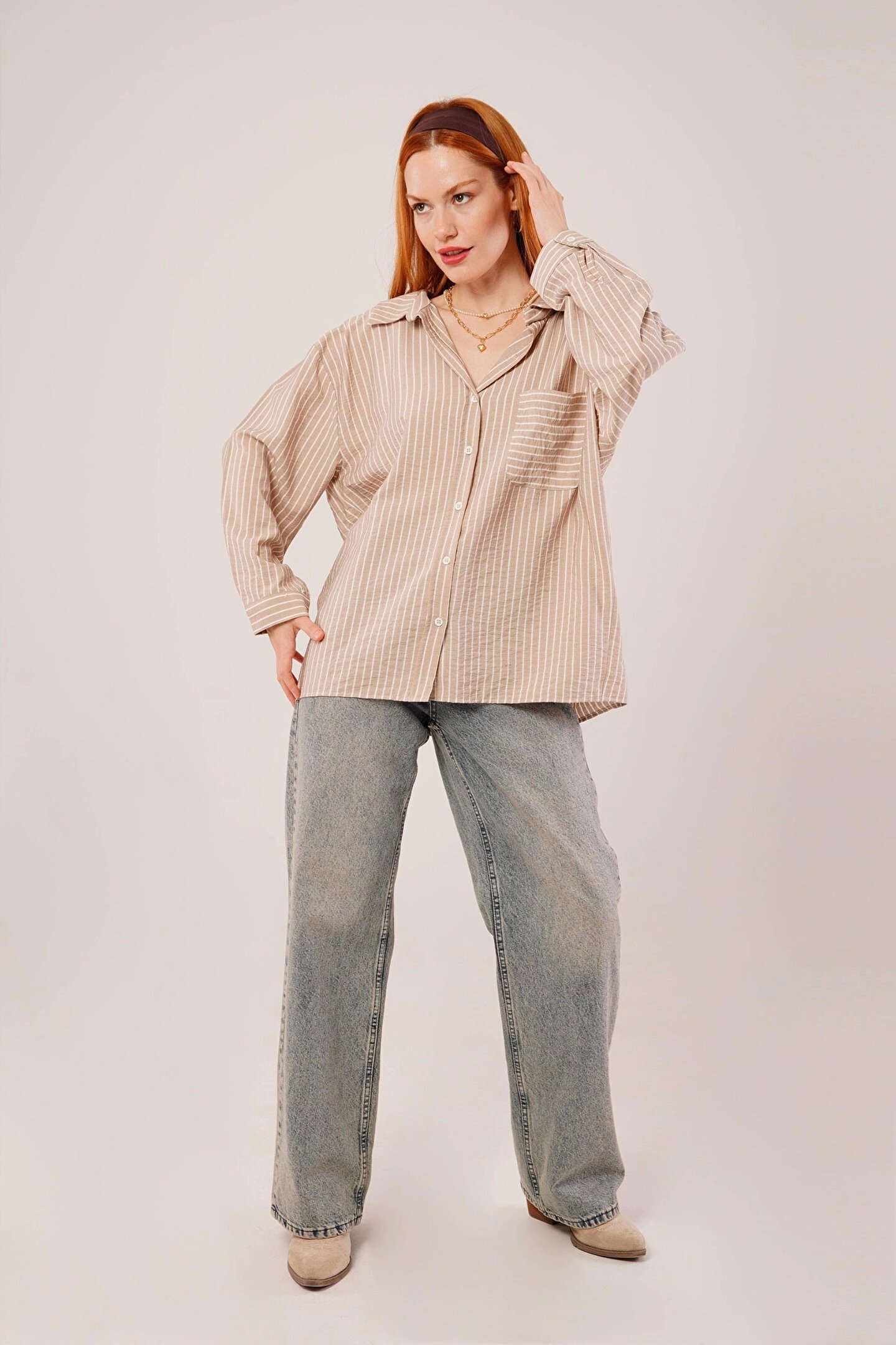 ASH GİYİM Çizgi Detaylı Cepli Camel Gömlek