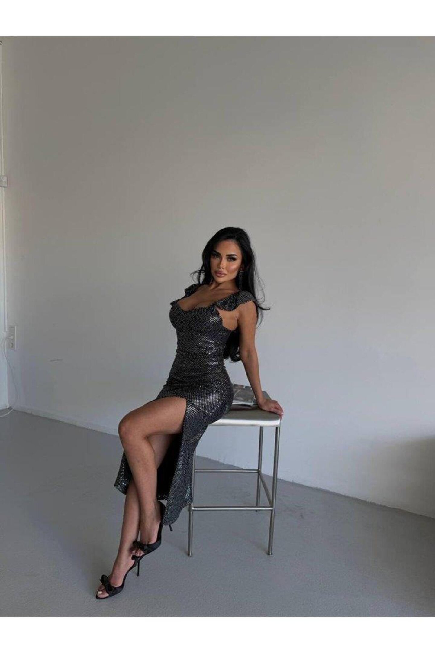 Kadın Askılı Belden Bağlamalı Geometrik Desen Krep Elbise