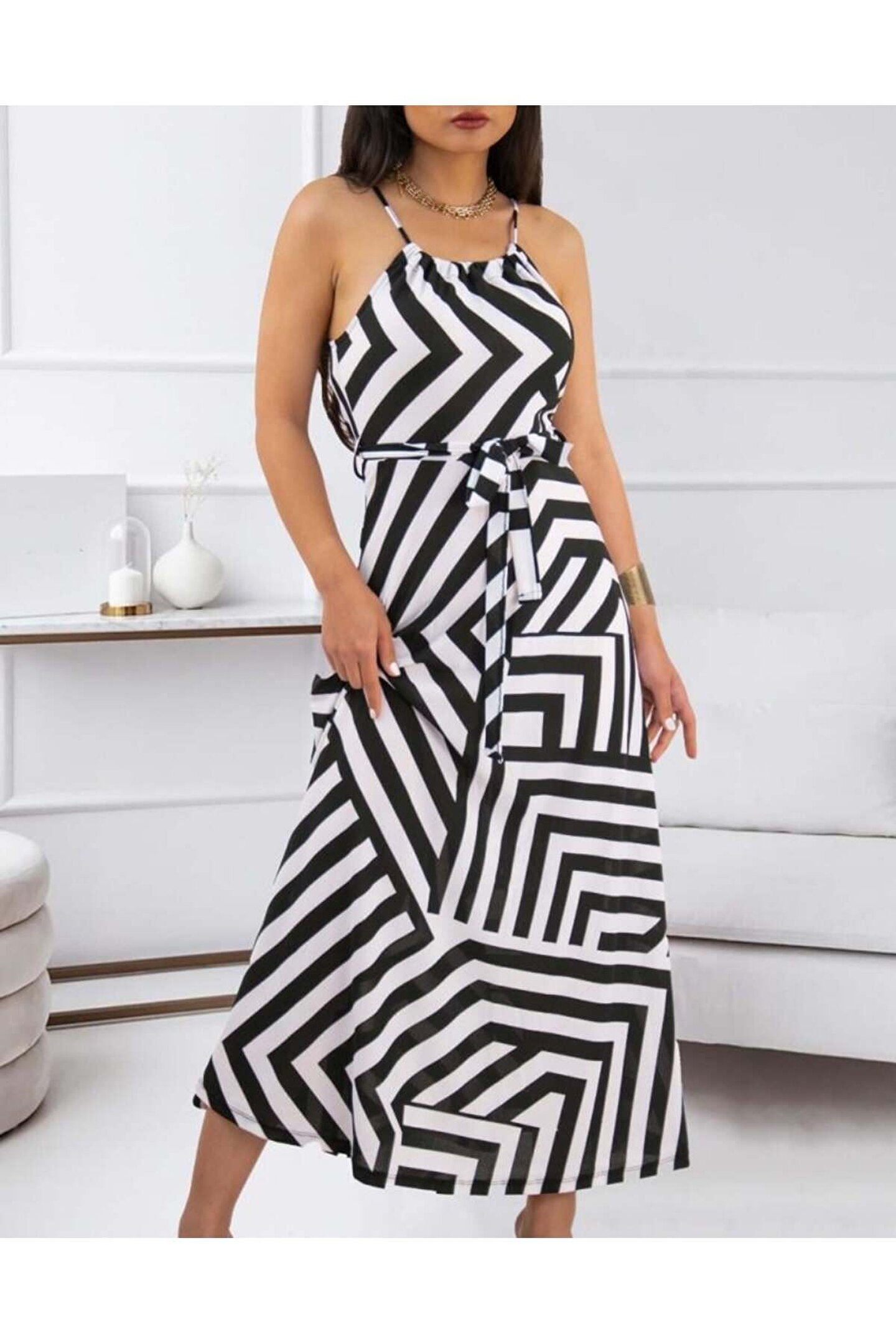Kadın Askılı Belden Bağlamalı Geometrik Desen Krep Elbise