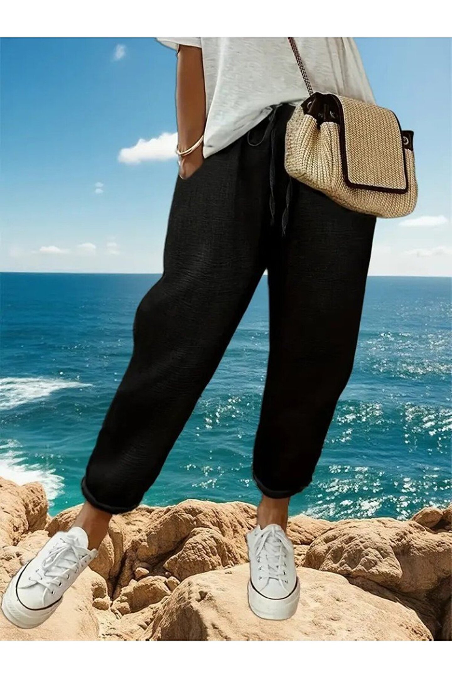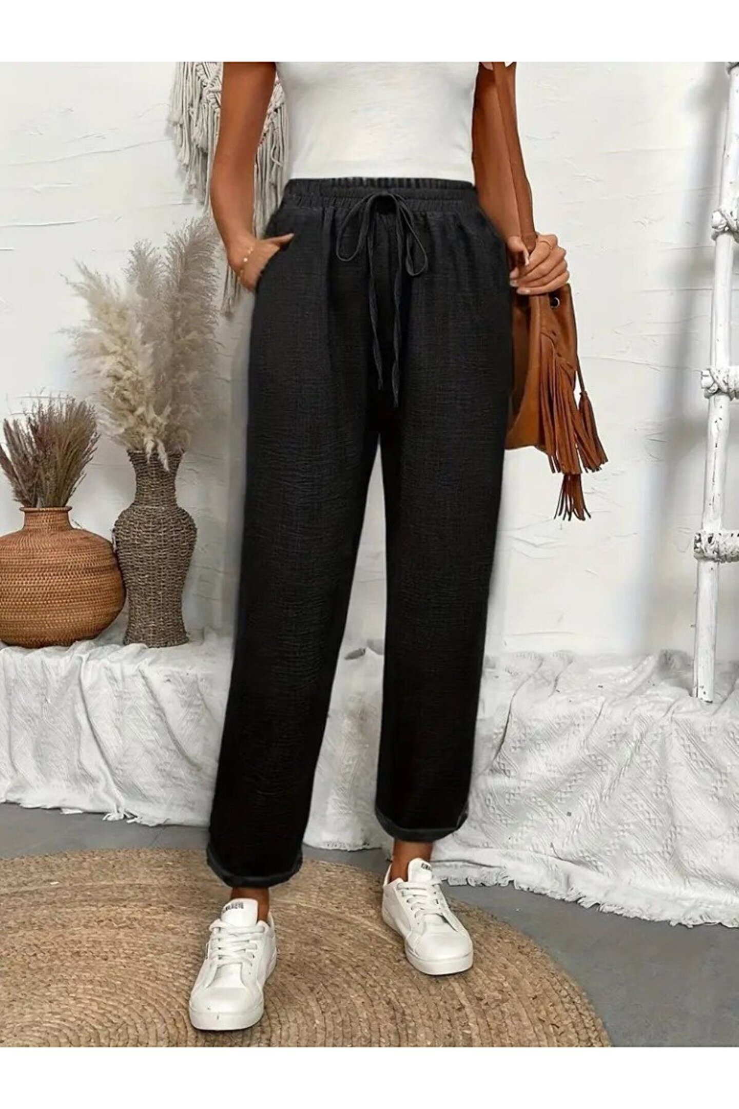 Kadın Yüksek Bel Lastikli Belde Bağcık Detaylı Aerobin Pantolon