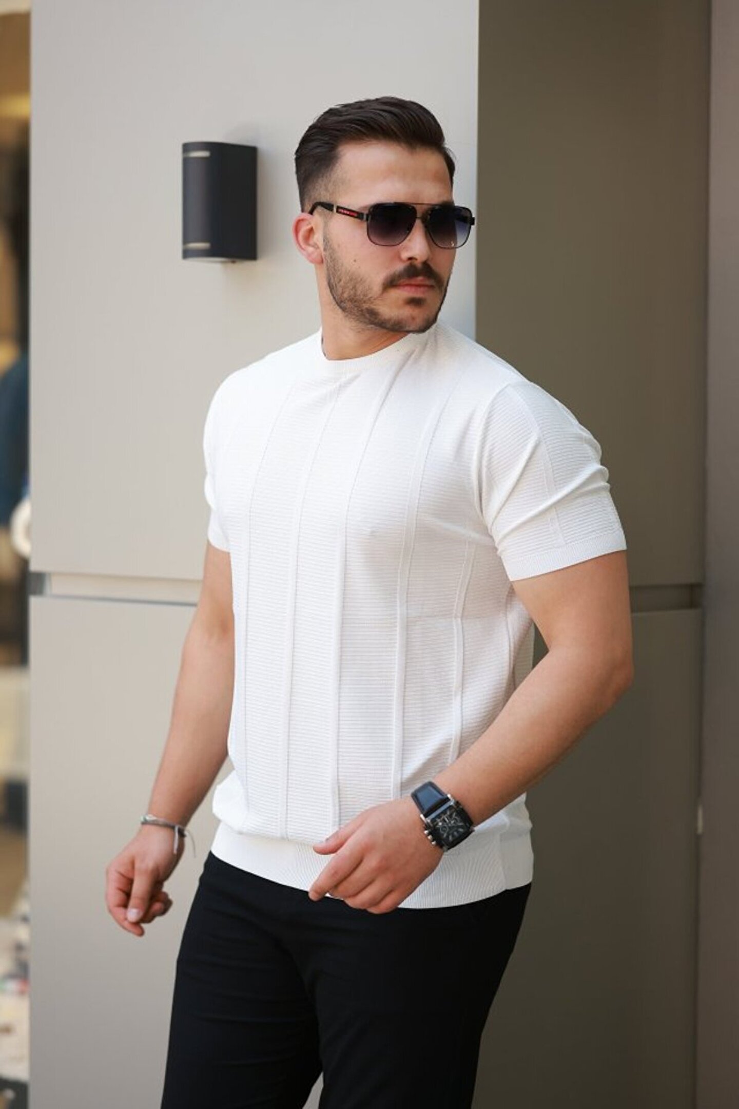 Erkek Desenli çizgi Kabartmalı Kısa Kollu Tişört