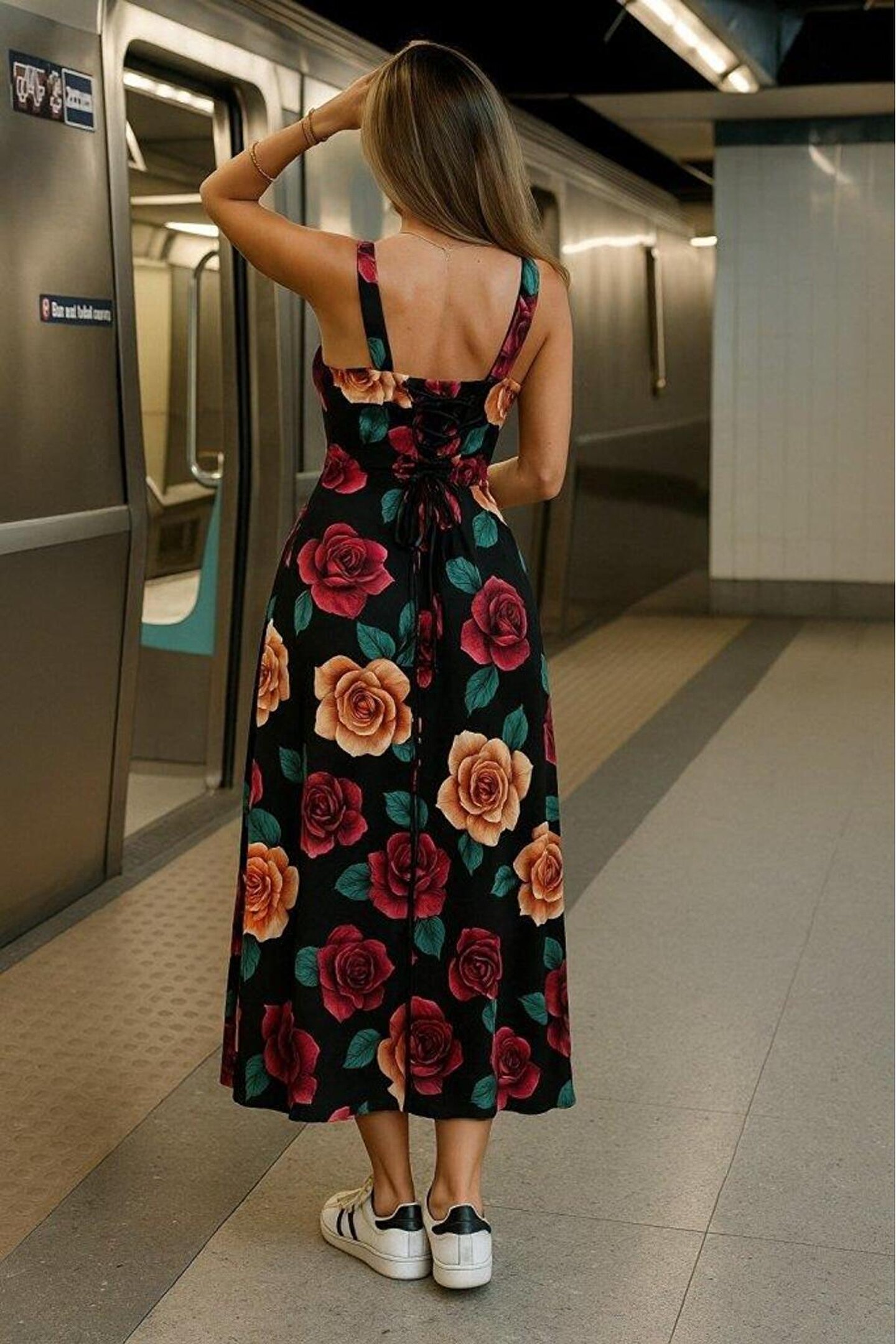 Kadın Askılı Geniş V Yakalı Sırttan Bağlamalı Yırtmaçlı Süprem Elbise