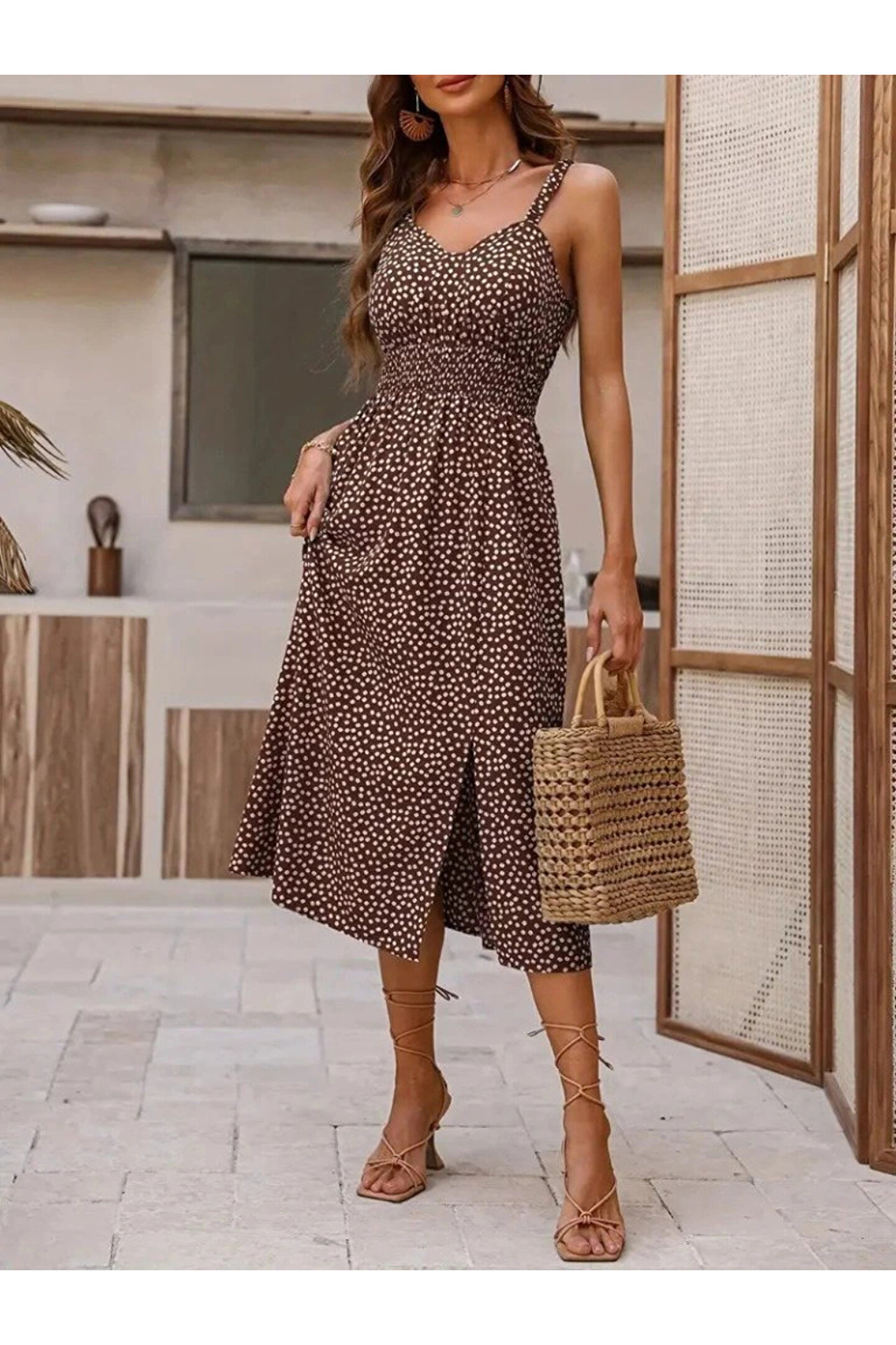 Asil Acar Home Kadın Askılı V Yakalı Beli Lastikli Yırtmaçlı Süprem Midi Elbise