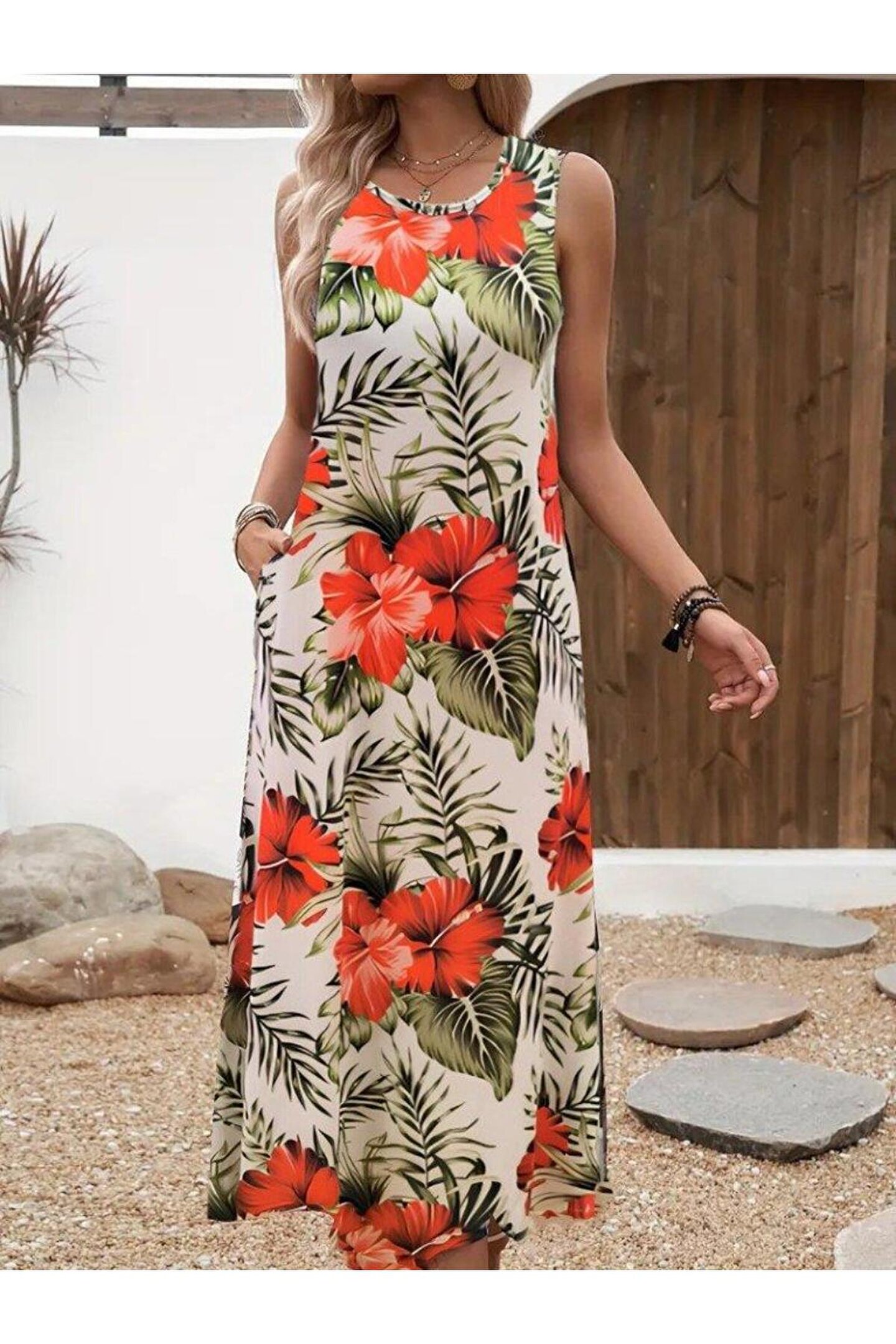 Kadın Askılı Yuvarlak Yaka Cepli Desenli Süprem Elbise