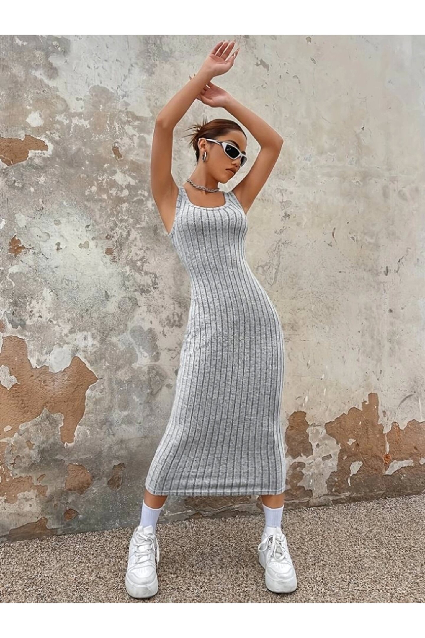Kadın Kalın Askılı Kare Yaka Fitilli Kaşkorse Midi Boy Elbise