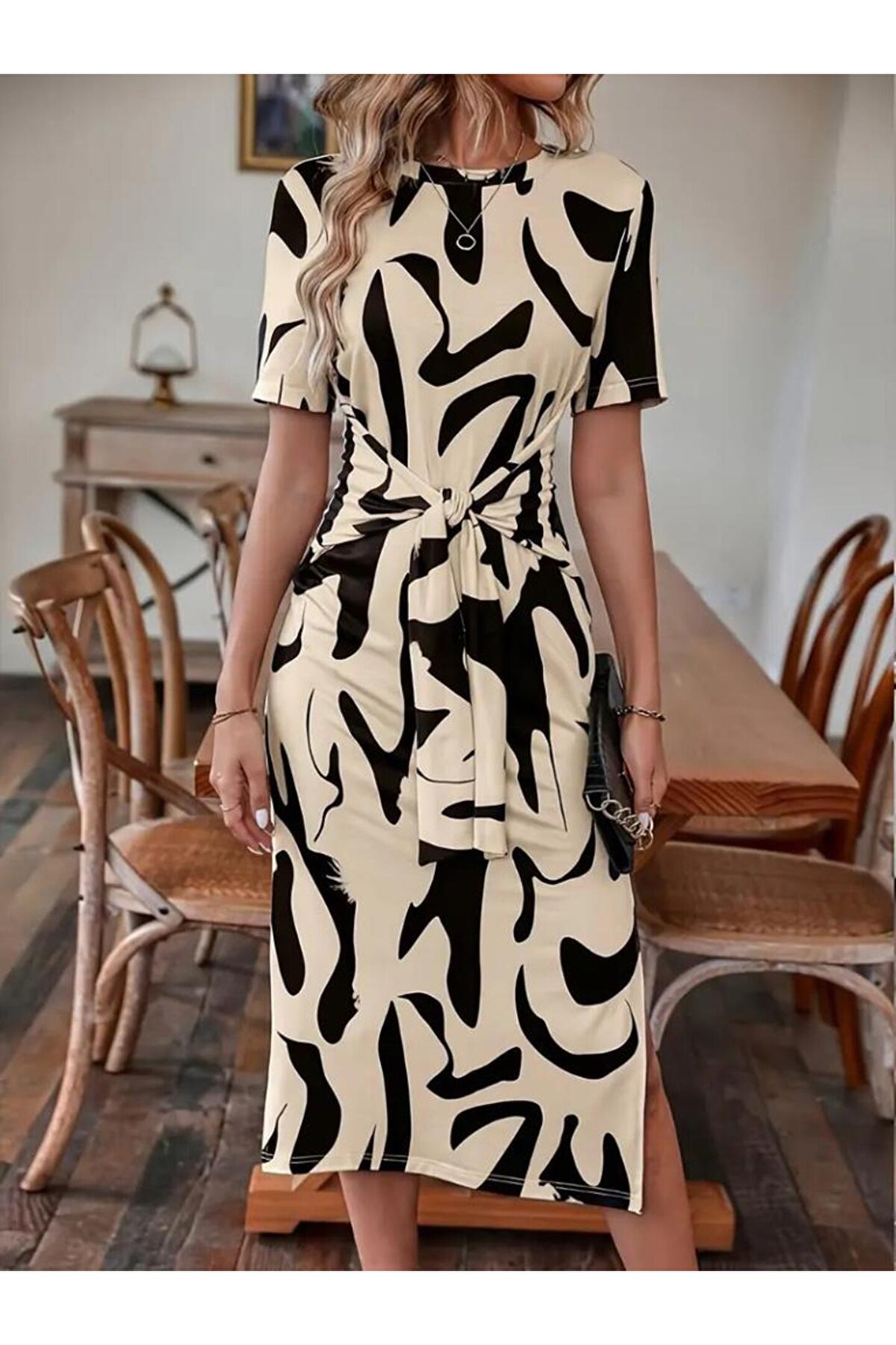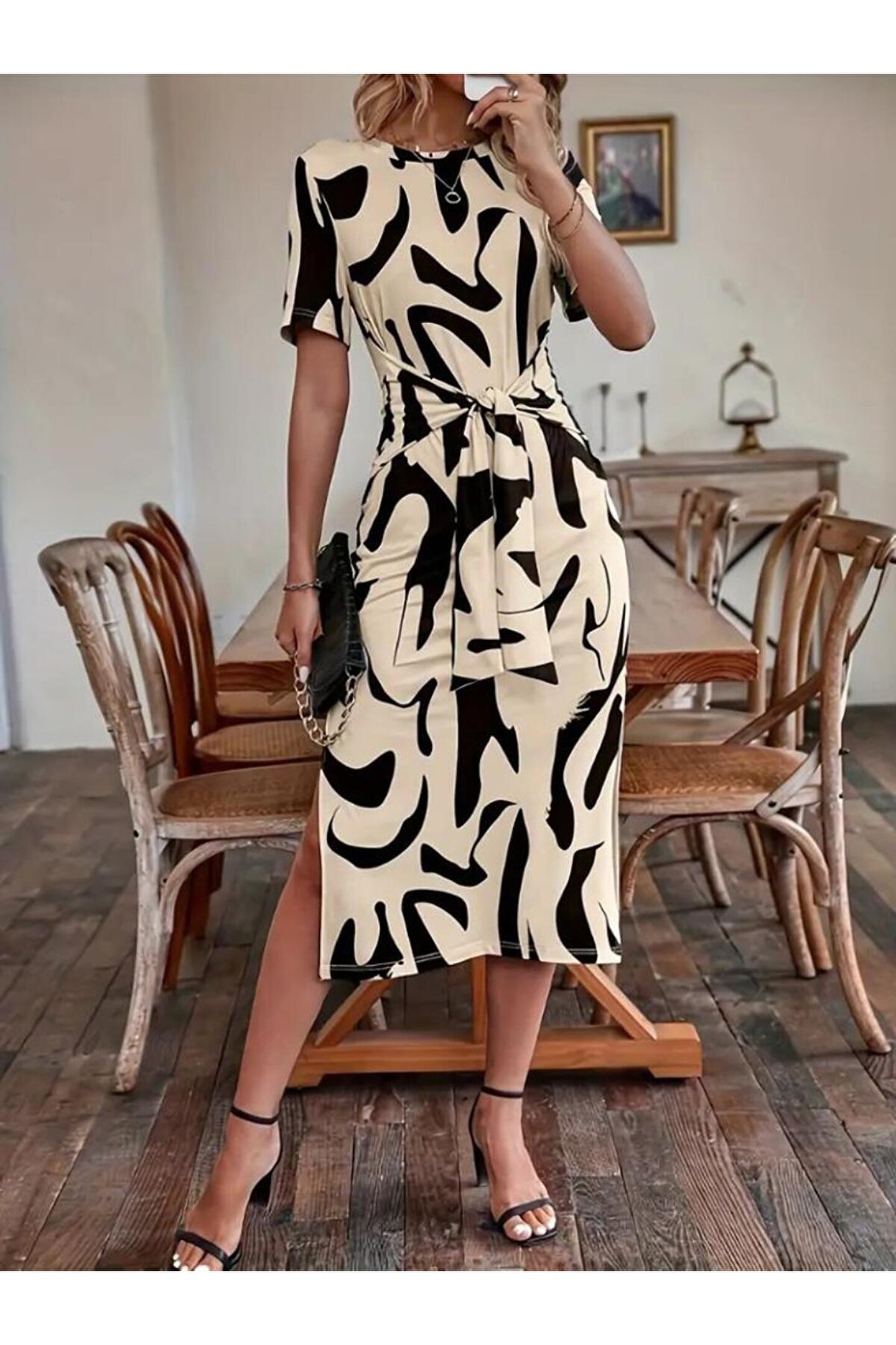 Kadın Kısa Kollu Bisiklet Yaka Desenli Belden Bağlamalı Yandan Yırtmaçlı Süprem Elbise