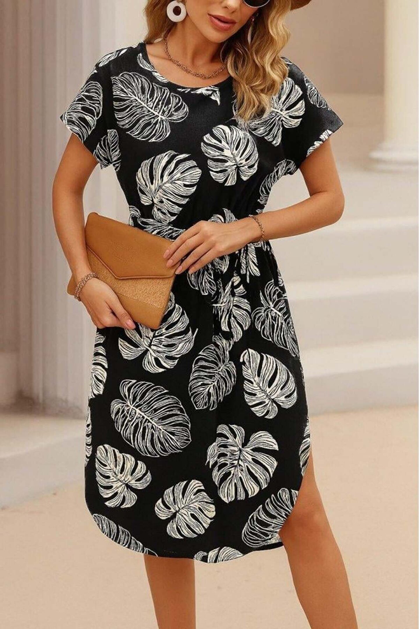 Kadın Kısa Kollu Bisiklet Yaka Desenli Kuşaklı örme Krep Midi Elbise
