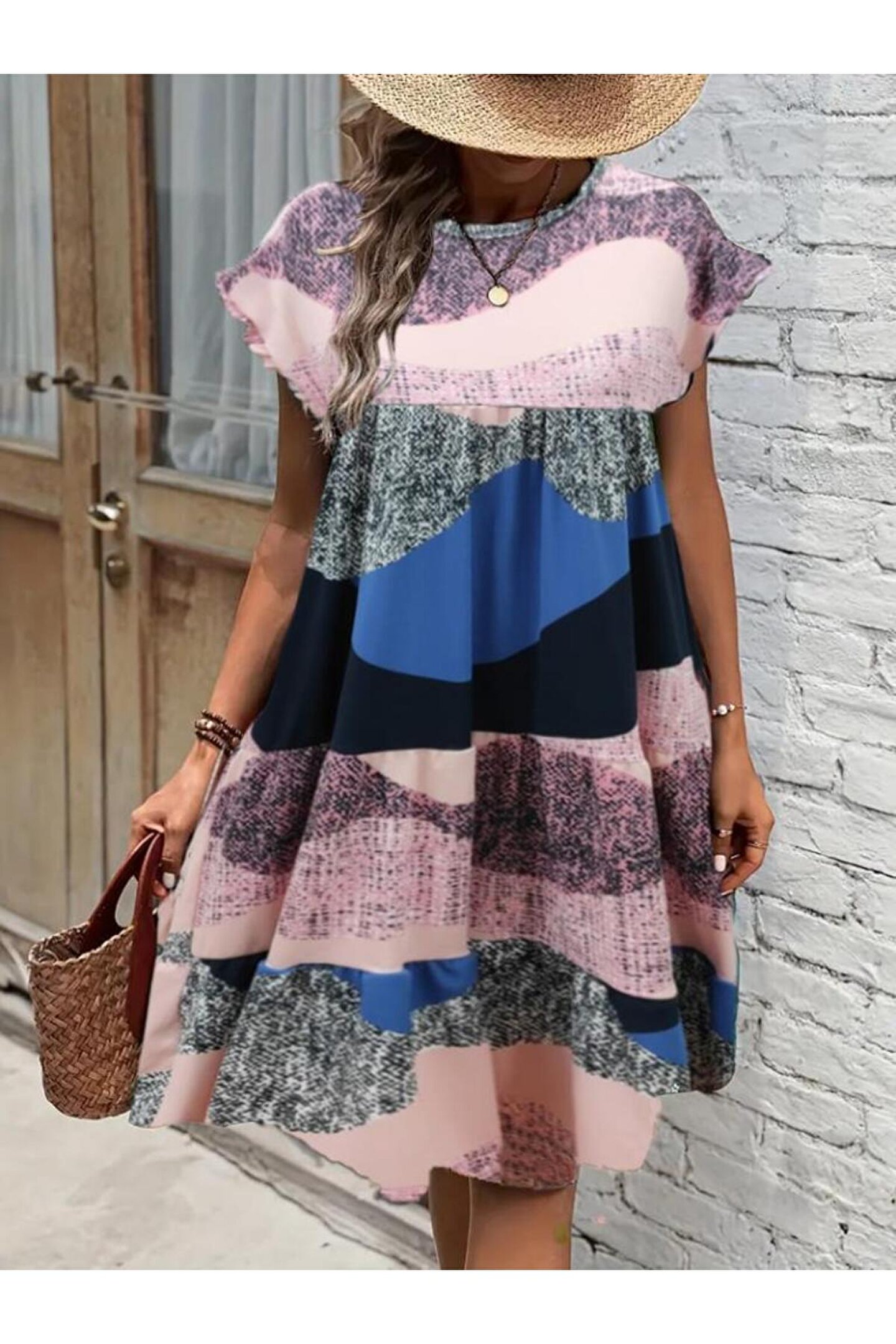 Kalın Askılı Kare Yaka Baskılı Keten Mavi Midi Boy Elbise