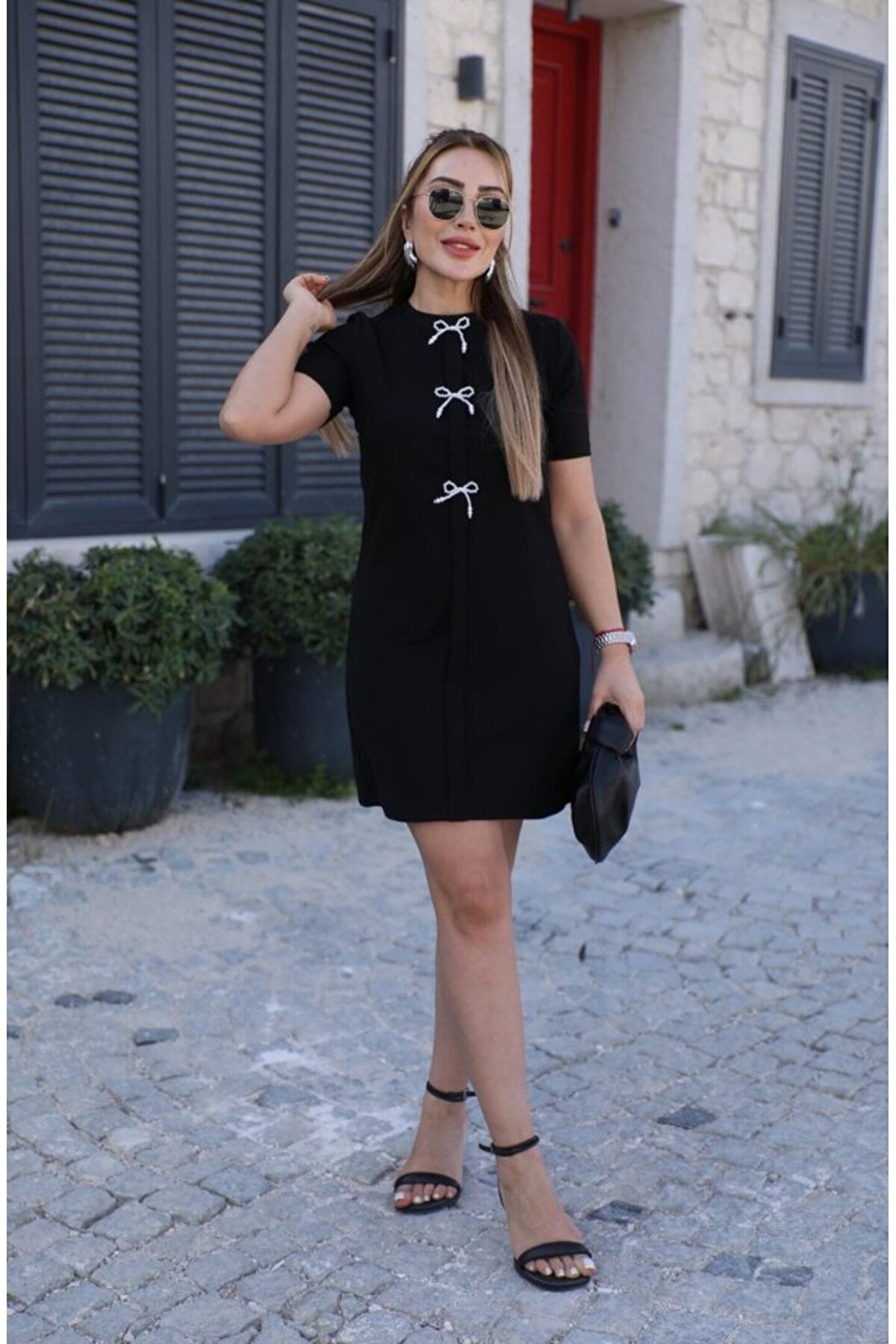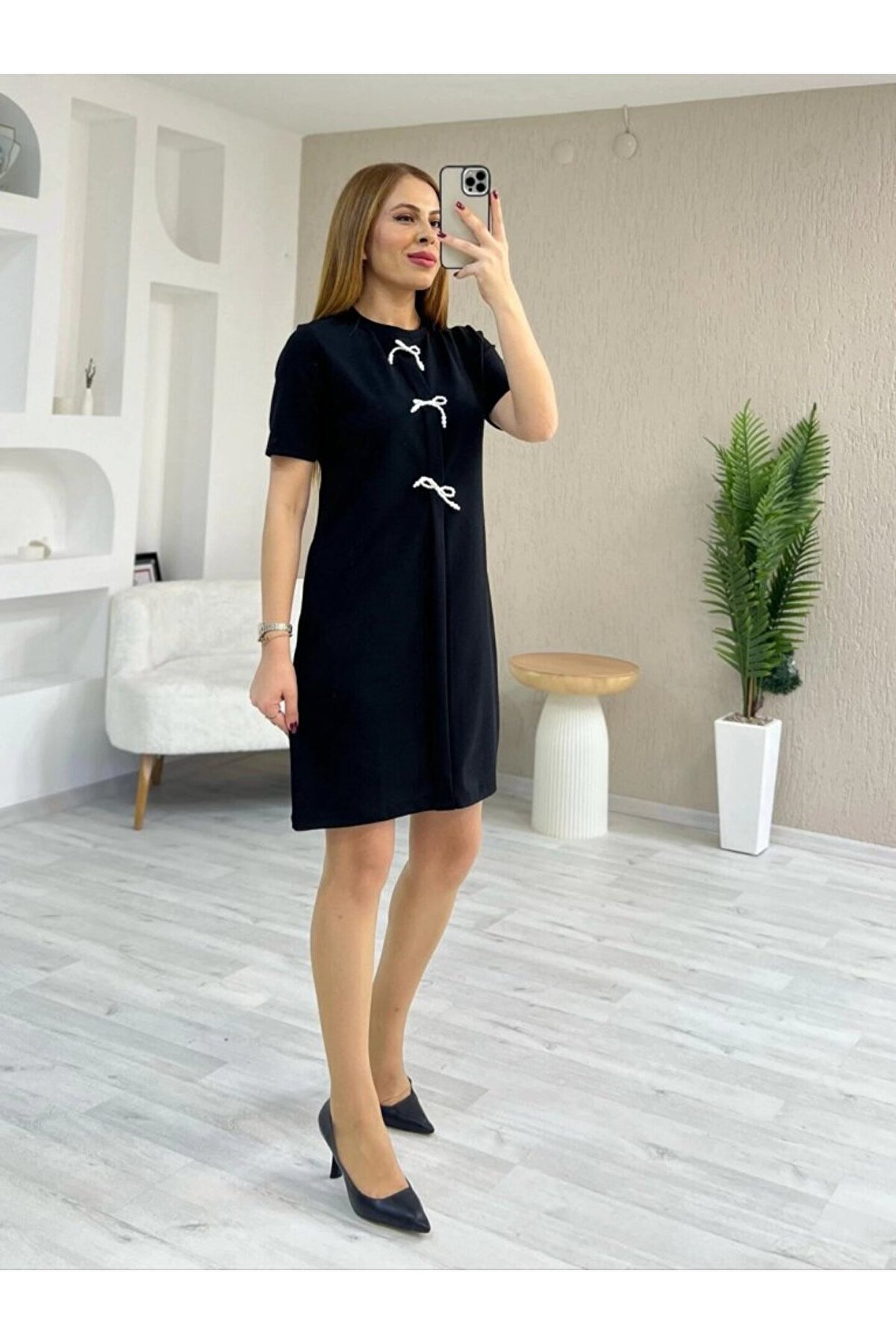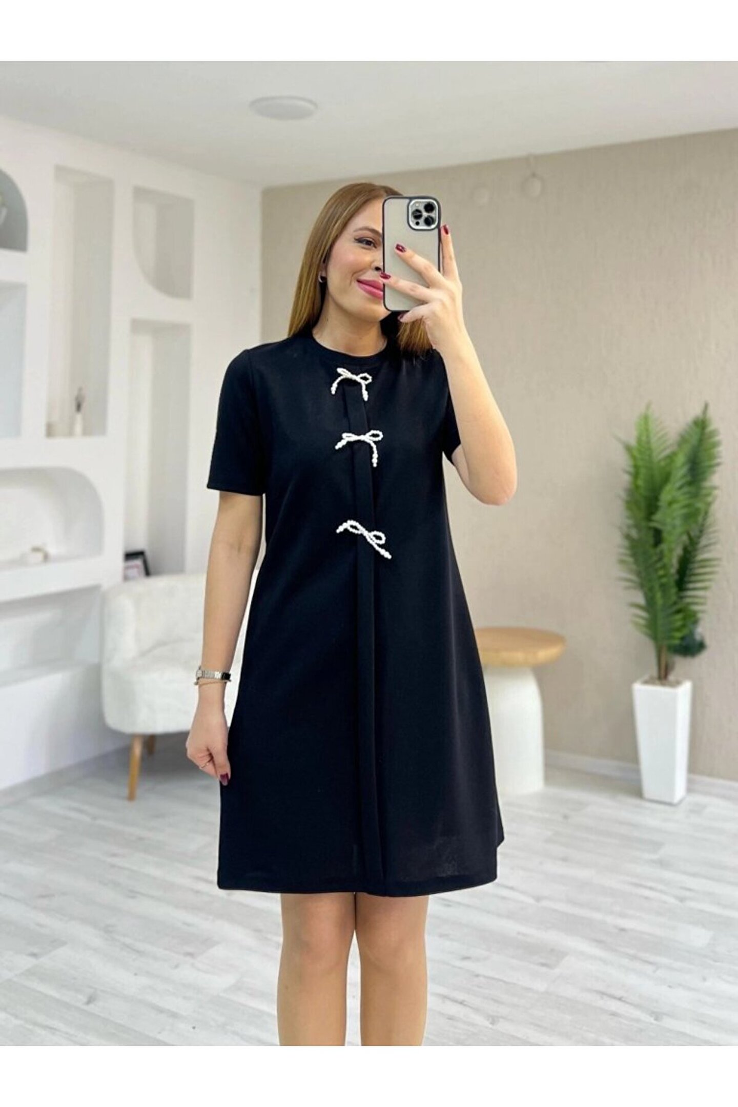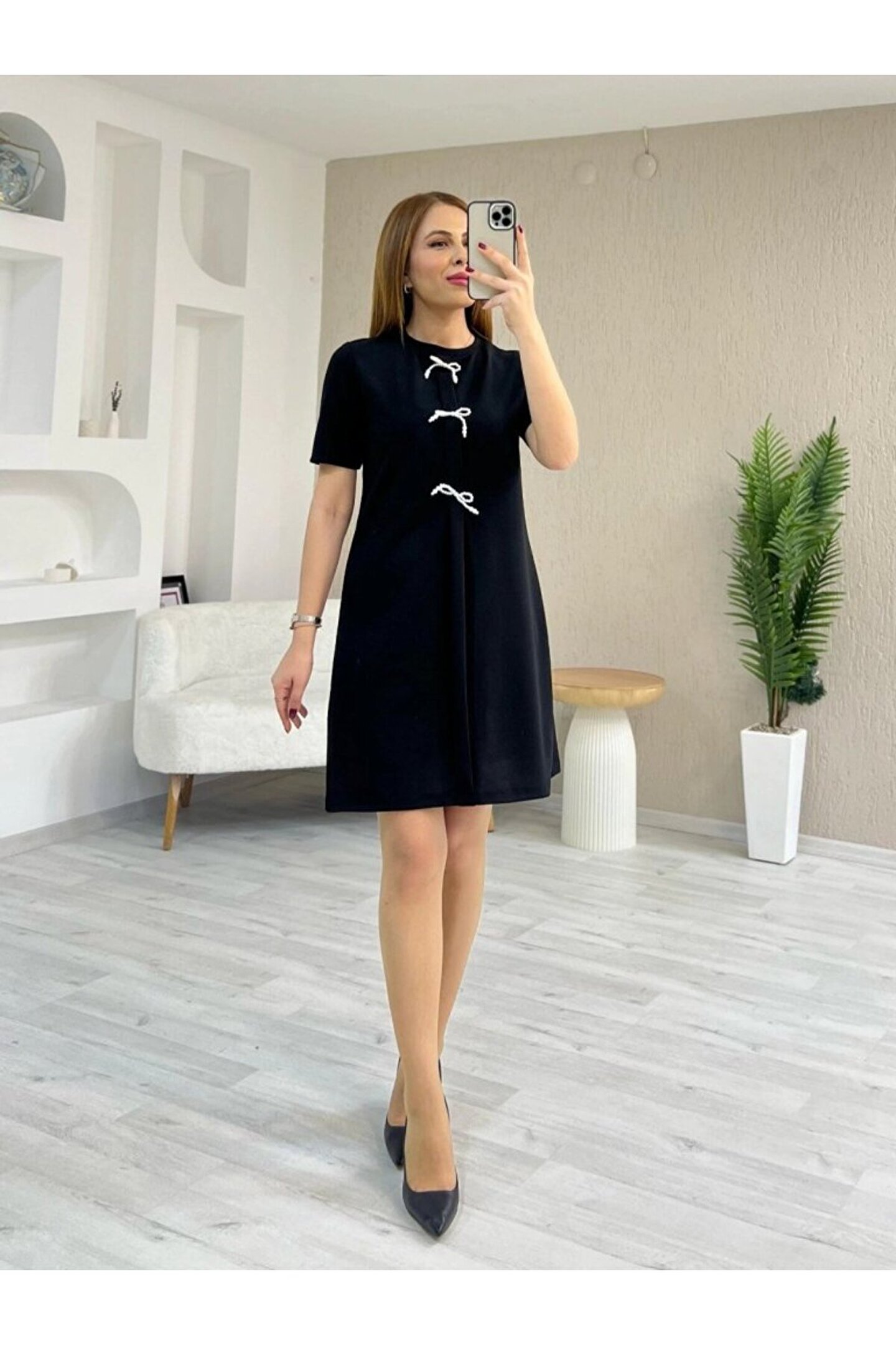 Kadın Kısa Kollu Bisiklet Yaka önden Fiyonk Detaylı Ithal Krep Elbise