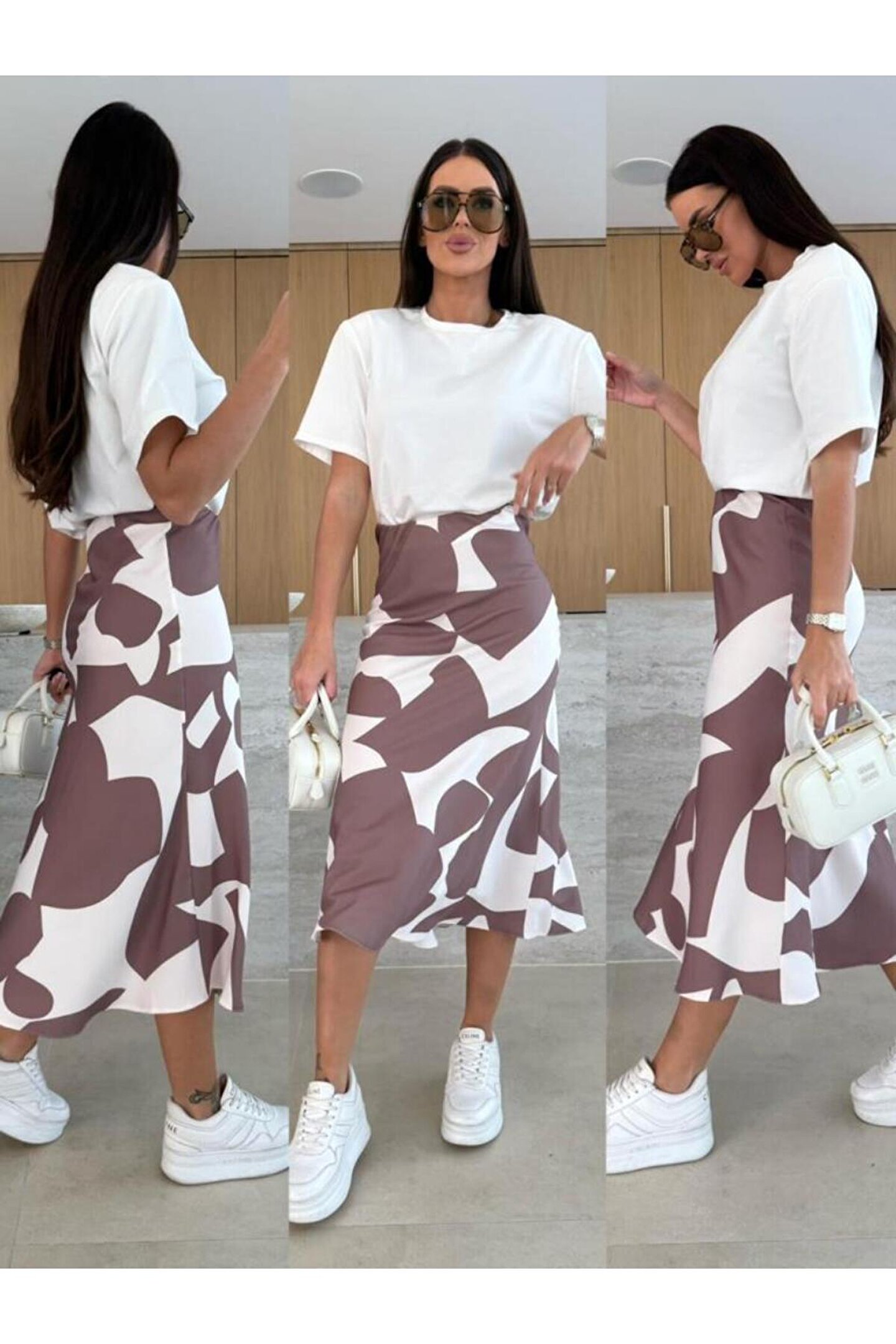 Kadın Kısa Kollu Bisiklet Yaka Viskon Bluz Ve Desenli Süprem Etek Ikili Takım