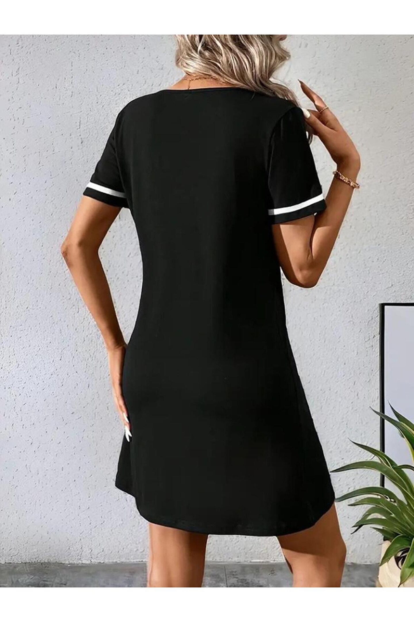 Kadın Kısa Kollu V çizgili Yakalı Kısa Viskon Elbise