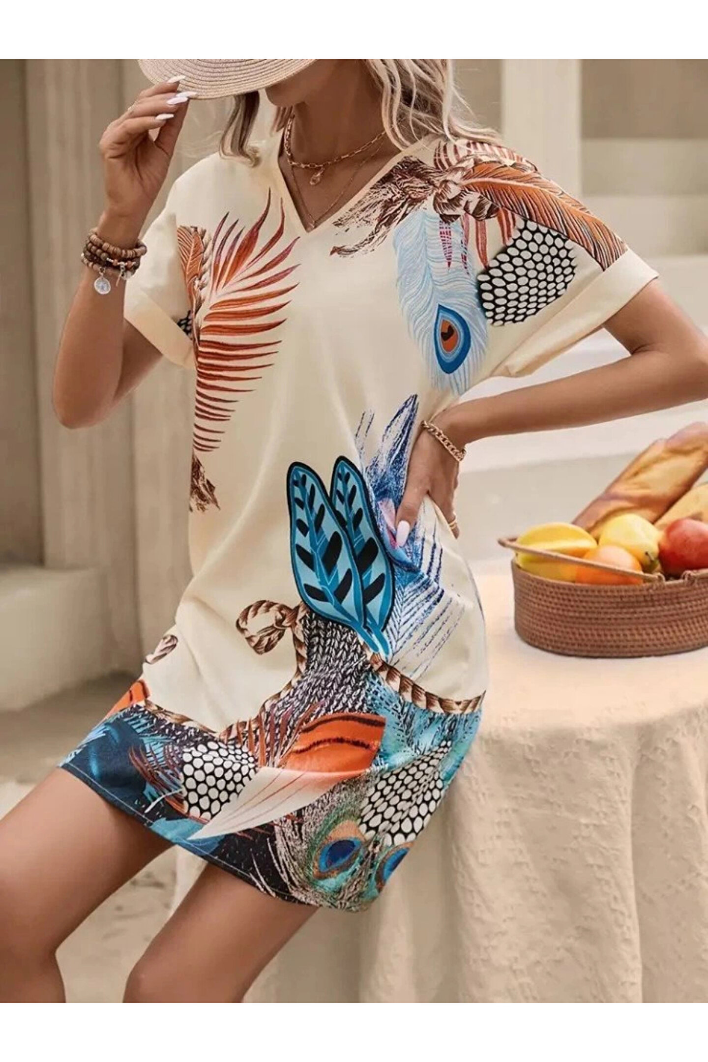 Kadın Kısa Kollu V Yakalı Desenli Mini Atlas Elbise