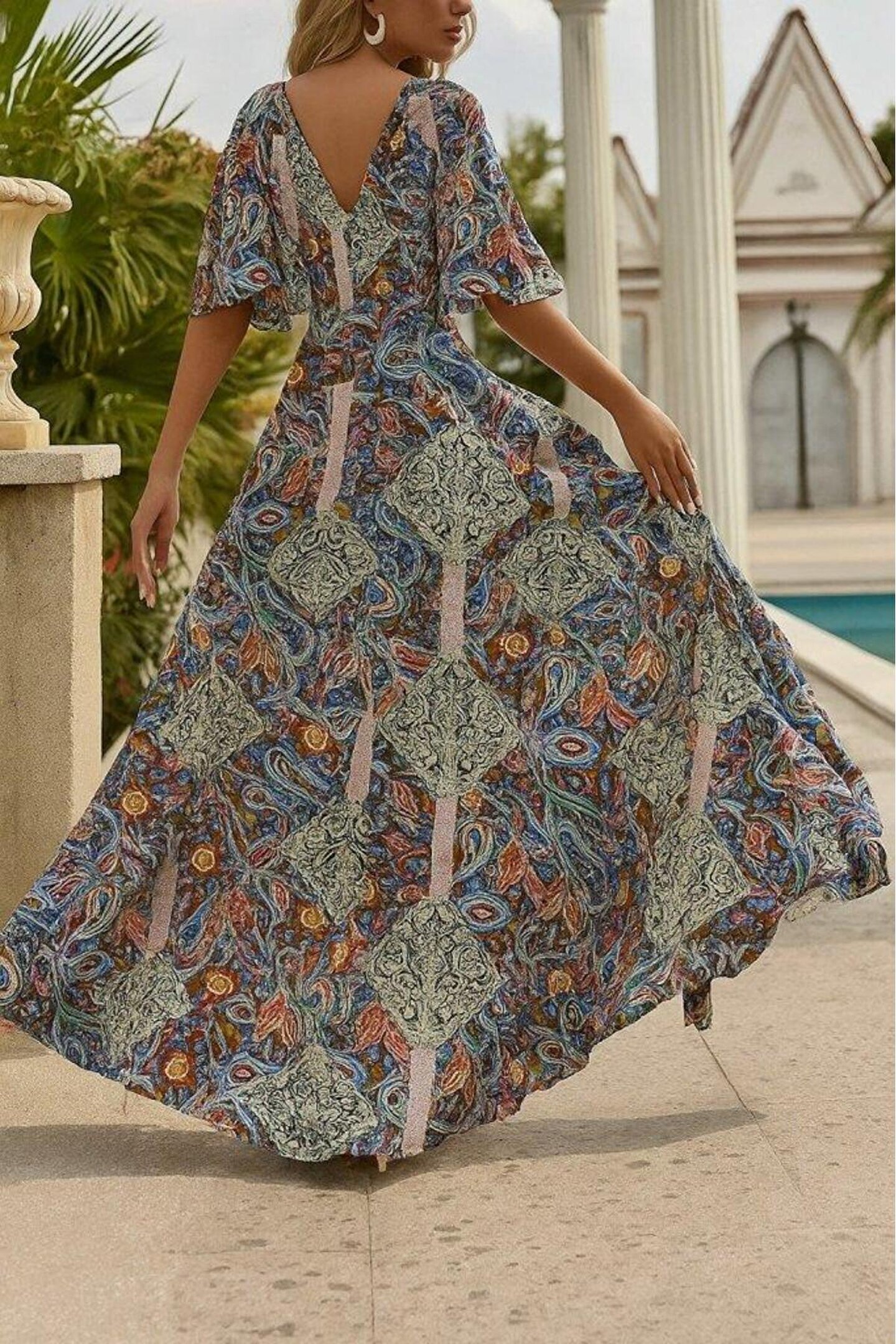 Kadın Kısa Kollu V Yakalı Desenli Süprem Elbise
