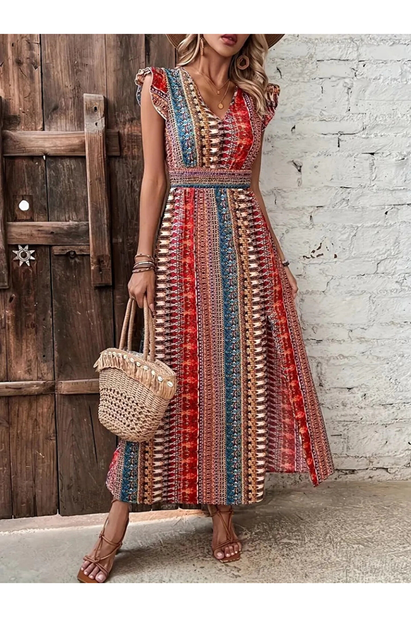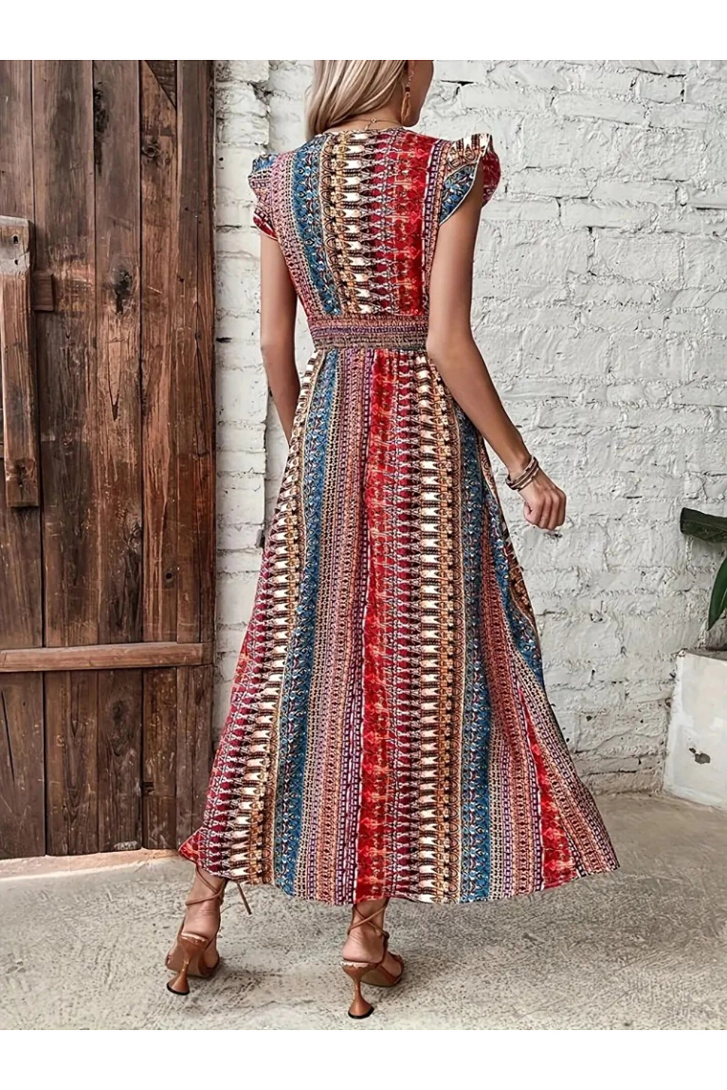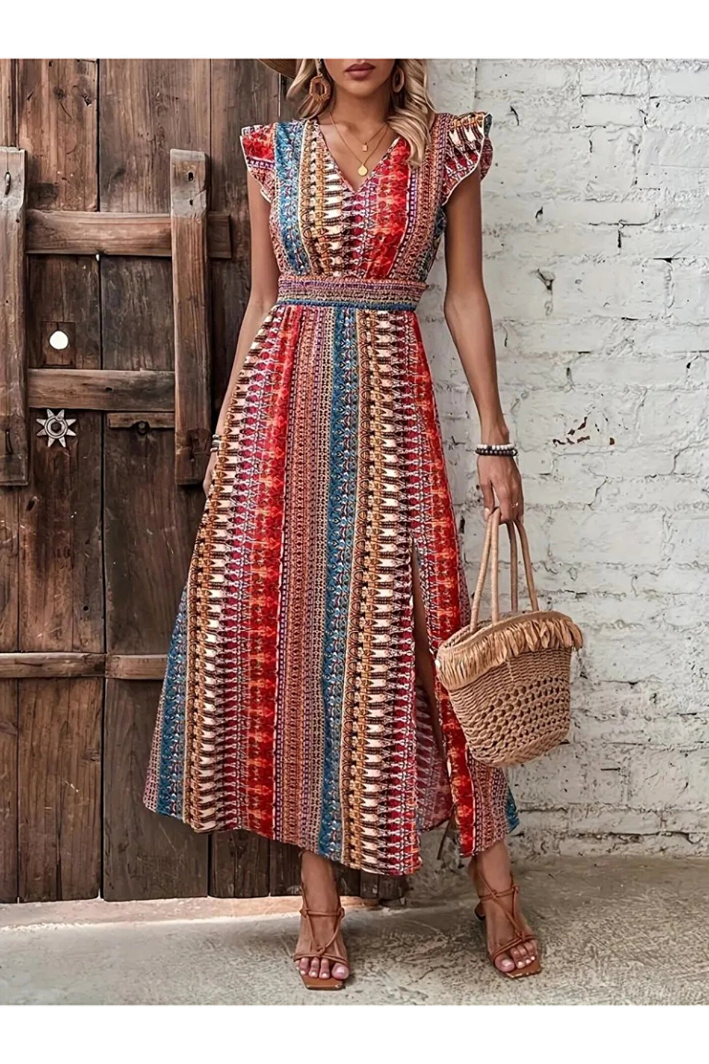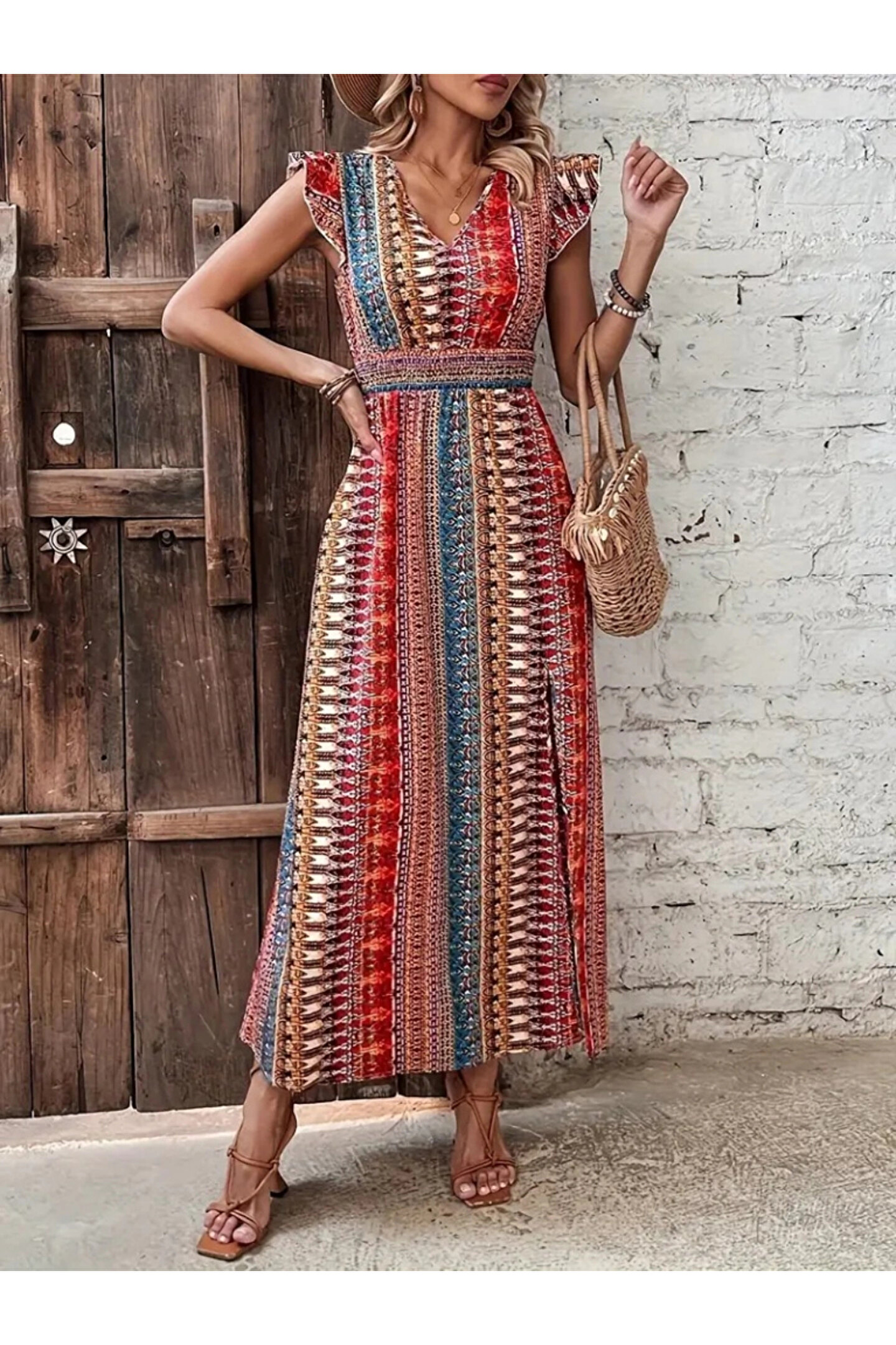Kadın Kısa Kollu V Yakalı Desenli Yandan Yırtmaçlı Süprem Elbise