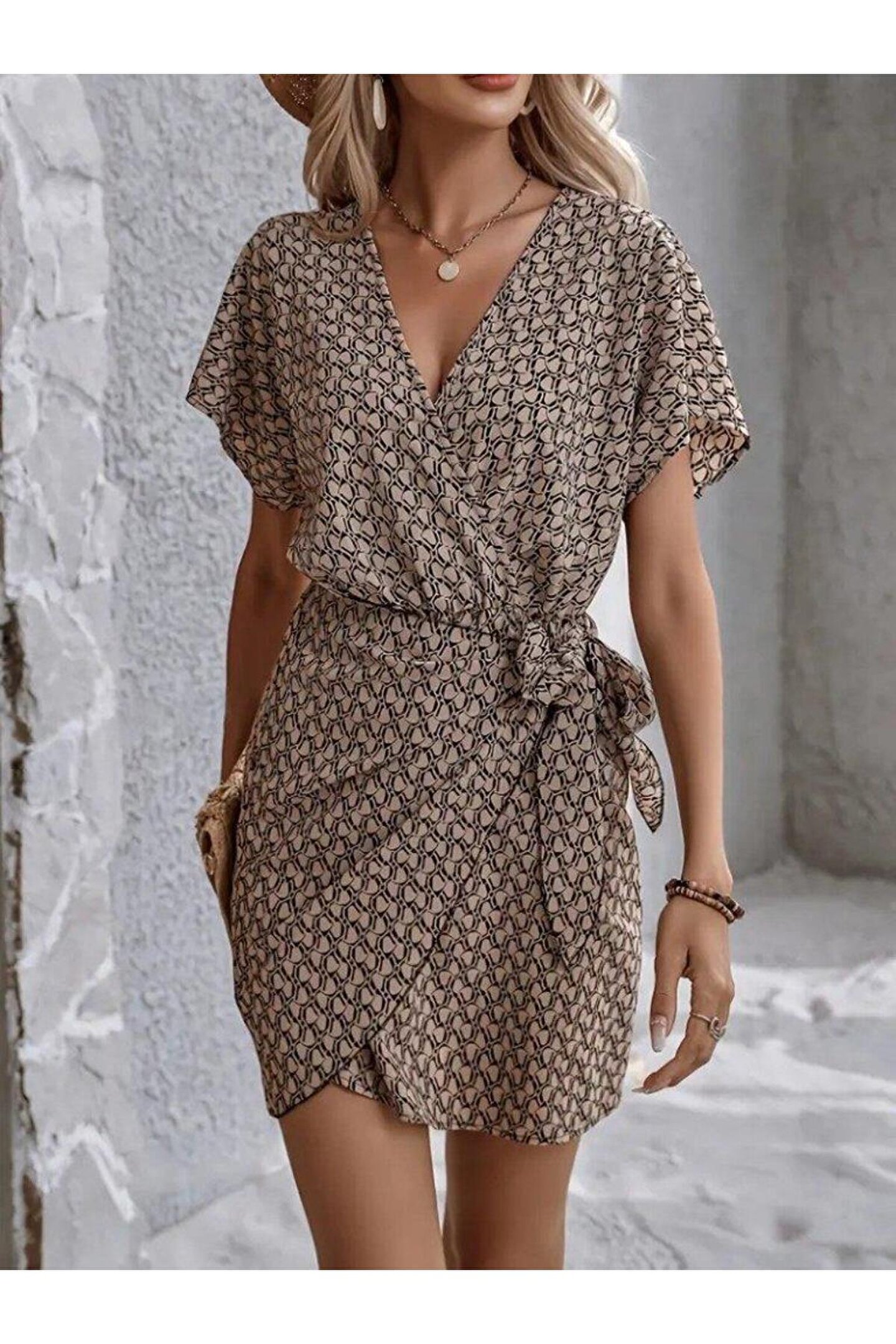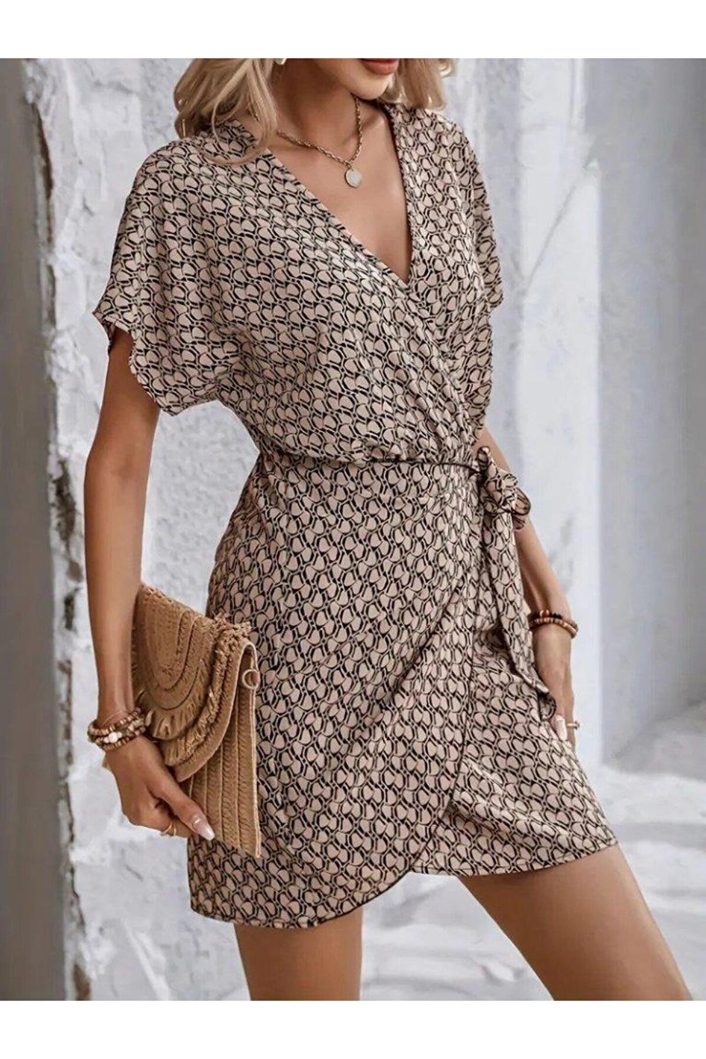 Kadın Kısa Yarasa Kollu önden Kruvaze Yaka Detaylı önden Bağlamalı Desenli Süprem Elbise