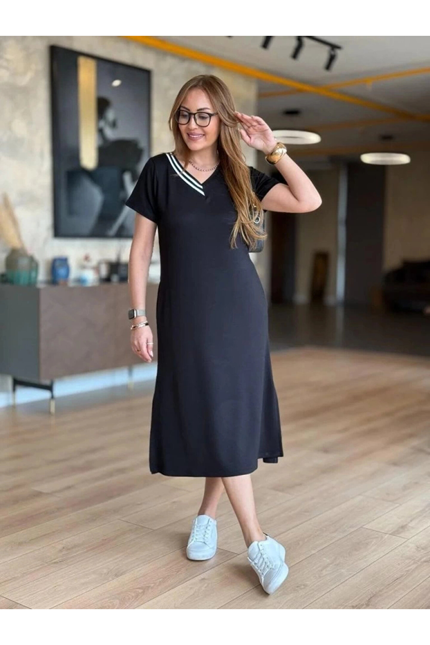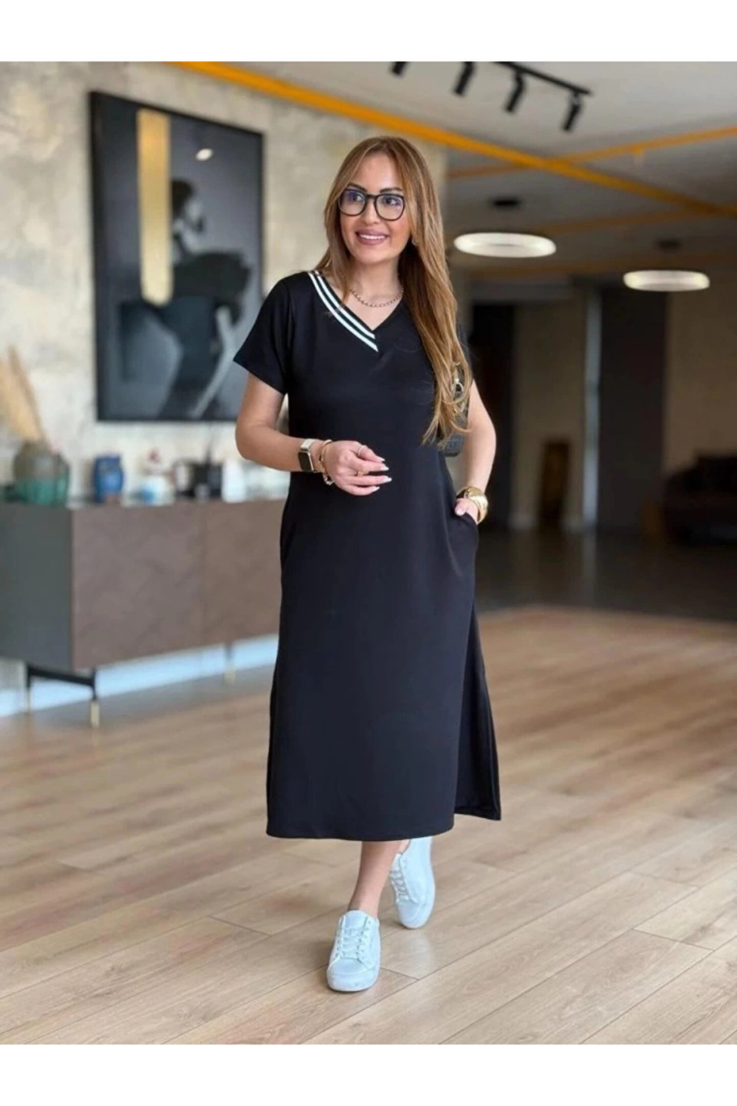 Kadın Kısa Kollu V Ribana Yakalı Yırtmaçlı Midi Viskon Iki Iplik Elbise.; Ürün detayları ve kullanım hissi kişisel tercihlere göre değişiklik gösterebilir.
