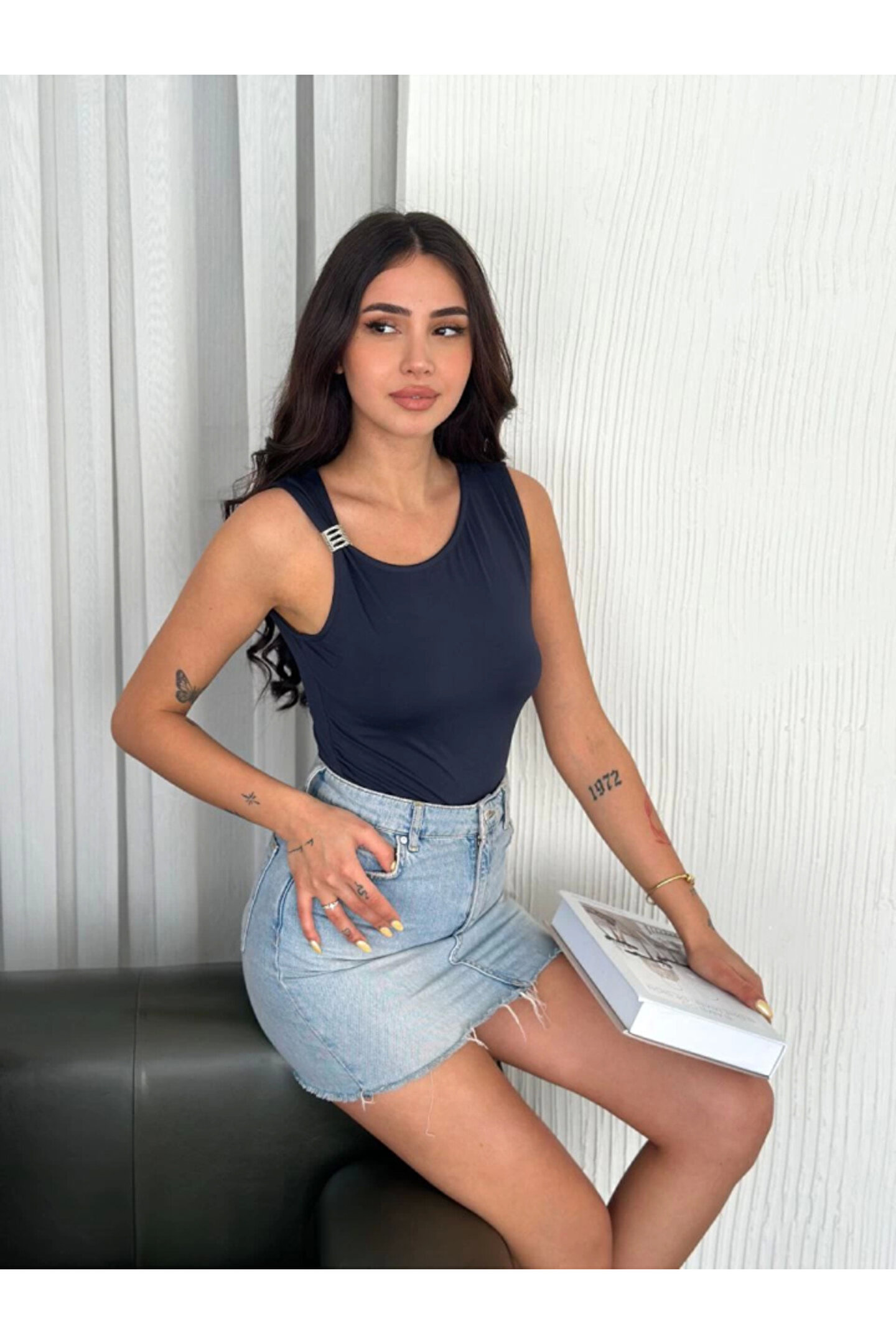 Osy Modal Yumuşak Dokulu Kumaş Bisiklet Yaka Sıfır Kol Bluz Omuz Toka Aksesuar Detaylı - Lacivert