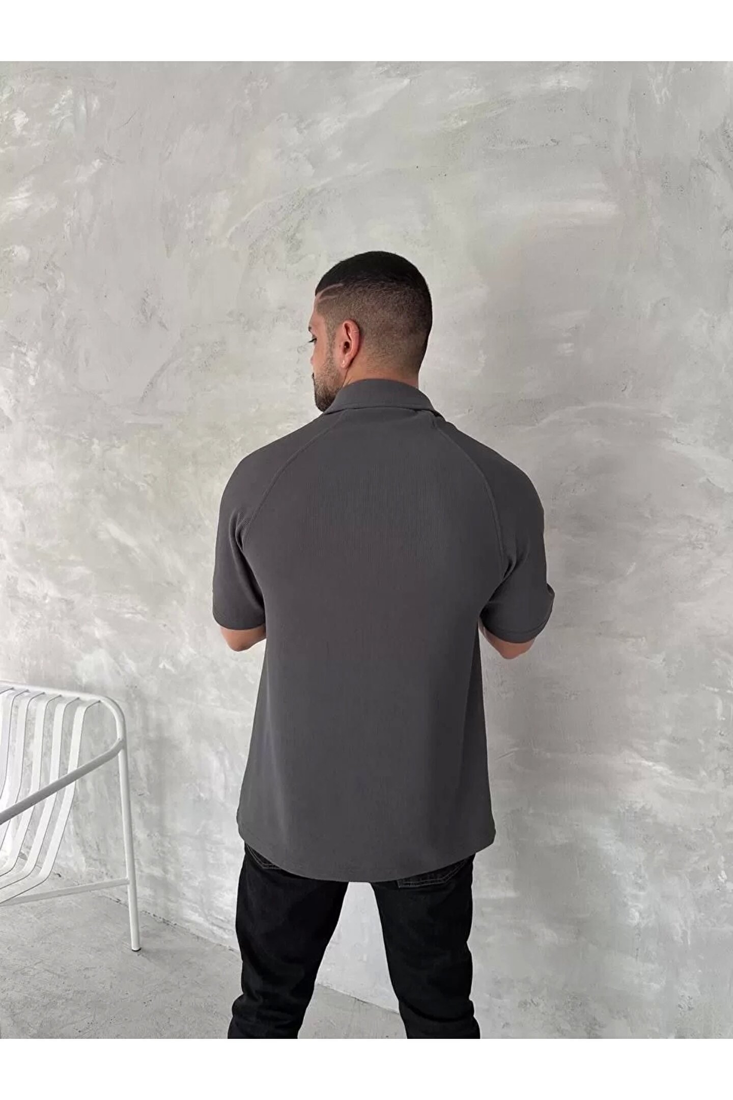 Yakalı Patlı Kısa Kol T-shirt - Antrasit