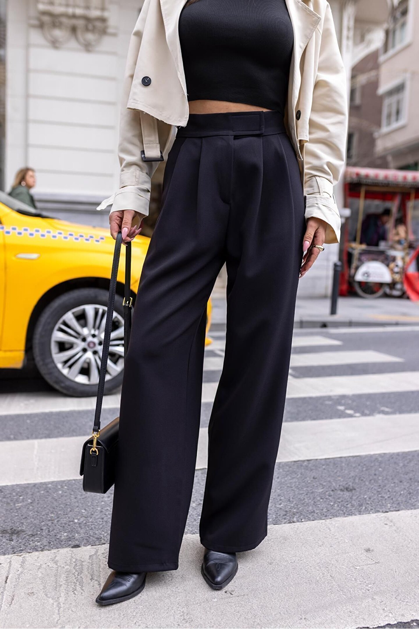 Askı Nişantaşı Siyah Beli Cırtcırtlı Pens Dikişli Palazzo Pantolon