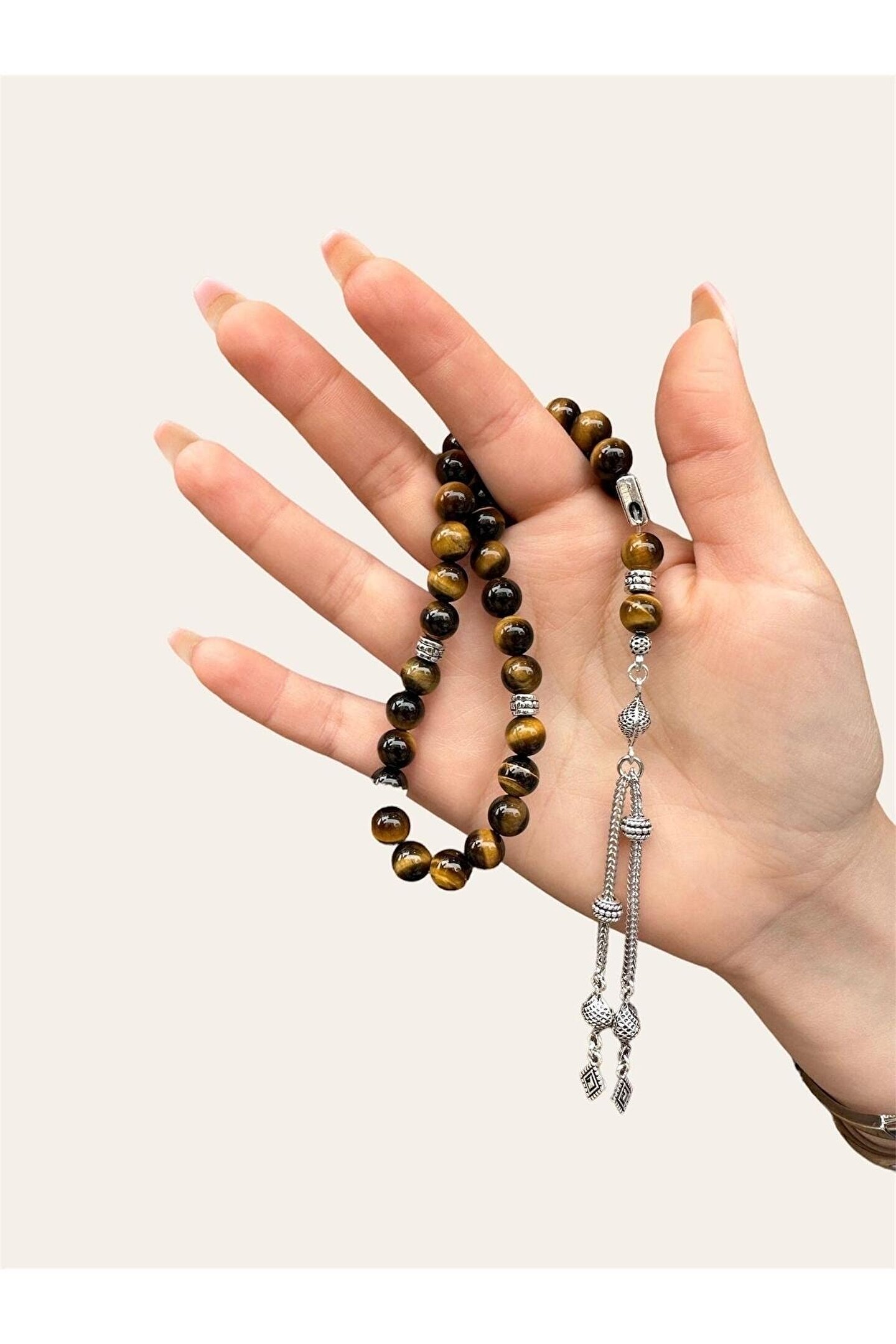 Paslanmaz çelik malzeme kullanılarak üretilmiş olup, dayanıklılığı ve uzun ömürlü kullanımı garanti eder; Doğal taş detayları ile zenginleştirilmiş tasarım, her bir tesbih tanesi benzersiz bir dokunuş sunar; 8 mm küre kesim kaplan gözü doğal taş, hem estetik hem de manevi bir değer katarak kullanıcıya özel bir deneyim sağlar;