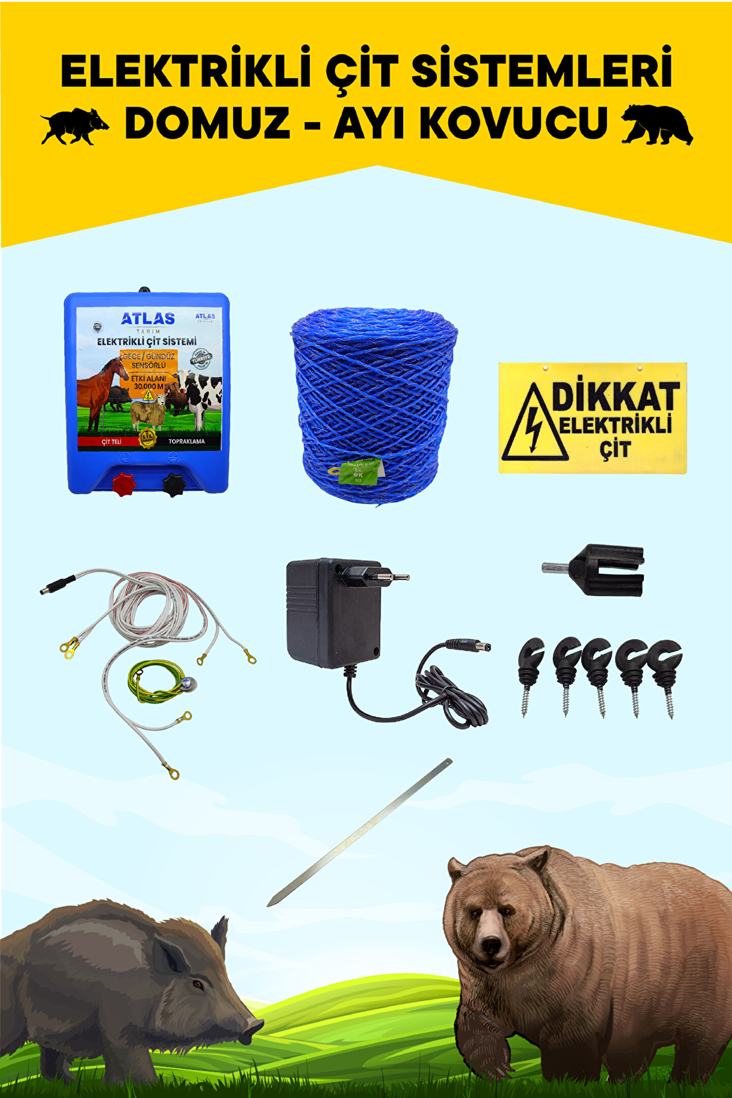ATLAS MARKA TÜM ELEKTRONİK CİHAZLARDA 5 YIL GARANTİ MEVCUTTUR. KURULUM DESTEĞİ ÜCRETSİZ VERİLMEKTEDİR. HER YIL CİHAZ ALMANIZA GEREK YOK ÖMÜRLÜK BİR SİSTEMDİR. AKÜ YERİNE Lİ-PO BATARYA SİSTEMLERİMİZDE MEVCUTTUR. *****RESİMDE GÖRÜLEN TÜM ÜRÜNLER TARAFINIZA GÖNDERİLMEKTEDİR.***** Atlas Elektrikli Çit Sistemi Paket İçeriği: Elektrikli Çit Cihazı 30.000 VOLT Tesirli Gece Gündüz Sensörlü Korumalı Devreli ADAPTÖRLÜ; 500 Metre Krom Tel Kaplamalı Elektrikli Çit İpi; 50 Adet Vidalı İzalatör; Bakır Bağlantı Kabloları; Paslanmaz Topraklama Çubuğu; İzalatör Sıkma Aparatı; Elektrikli Çit Uyarı Levhası; Kullanım Klavuzu; Kurulum Desteği Ücretsiz; Atlas Elektrikli Çit Sistemi, tarım ve hayvancılık alanında sınırlarınızı koruma, güvenliği artırma ve verimliliği optimize etme konusunda mükemmel bir çözümdür. Güçlü elektrikli çit sistemimiz, dayanıklı malzemeler ve ileri teknolojiyi bir araya getirerek kullanıcılara uzun ömürlü ve etkili bir çit deneyimi sunar. Bu çit sistemimiz, AKÜ, GÜNEŞ PANELİ, ADAPTÖR ile çalışabilmektedir. CİHAZ 30.000 METRE TESİRLİDİR 25 WATT GÜNEŞ PANELİ KULLANILMAKTADIR. GECE GÜNDÜZ SENSÖRÜ SAYESİNDE ENERJİ TASARRUFU SAĞLAR. ÖZEL TASARIMLI KUTU SAYESİNDE ISLANMA PROBLEMİ YAŞAMAZSINIZ. CİHAZIMIZDA KISA DEVRE KONTROLÜ MEVCUTTUR. 7-9 AMPER AKÜ İLE 7 GÜN GÜNEŞ GÖRMEDEN ÇALIŞABİLİR. 14 AMPER AKÜ İLE 14 GÜN GÜNEŞ GÖRMEDEN ÇALIŞABİLİR KULLANIM ALANLARI Tarım Alanları: Tarla sınırlarını koruma; Hasat dönemlerinde tarım ürünlerini çalıntıya karşı koruma; Tarla içindeki değerli bitkileri ve mahsulleri güven altına alma; ; Hayvancılık İşletmeleri: Hayvan otlatma alanları için güvenli sınırlar oluşturma; Hayvanların çevresel tehlikelerden korunması; Hayvanları belirlenmiş alanlarda tutma ve yönlendirme; ; Arıcılık Alanları: Arı kovanlarını koruma; Arılarla teması minimumda tutma; Arıcılık faaliyetlerini güvenli ve verimli bir şekilde yönetme; ; Ormancılık ve Doğa Koruma: Orman sınırlarını koruma; Doğal yaşam alanlarını koruma altına alma; Yaban hayvanlarıyla teması sınırlama; ; Besi ve Çiftlik İşletmeleri: Besi alanları ve çiftlik sınırlarını güçlendirme; Hayvanların istenmeyen bölgelere girmesini önleme; Hayvan güvenliği ve yönetimi için kullanma; ; Ranch ve Evcil Hayvan İşletmeleri: Büyük arazileri güvenli bir şekilde çevreleme; Evcil hayvanların serbest dolaşımını kontrol etme; Hayvanları dışarıdan gelebilecek tehlikelere karşı koruma; ;