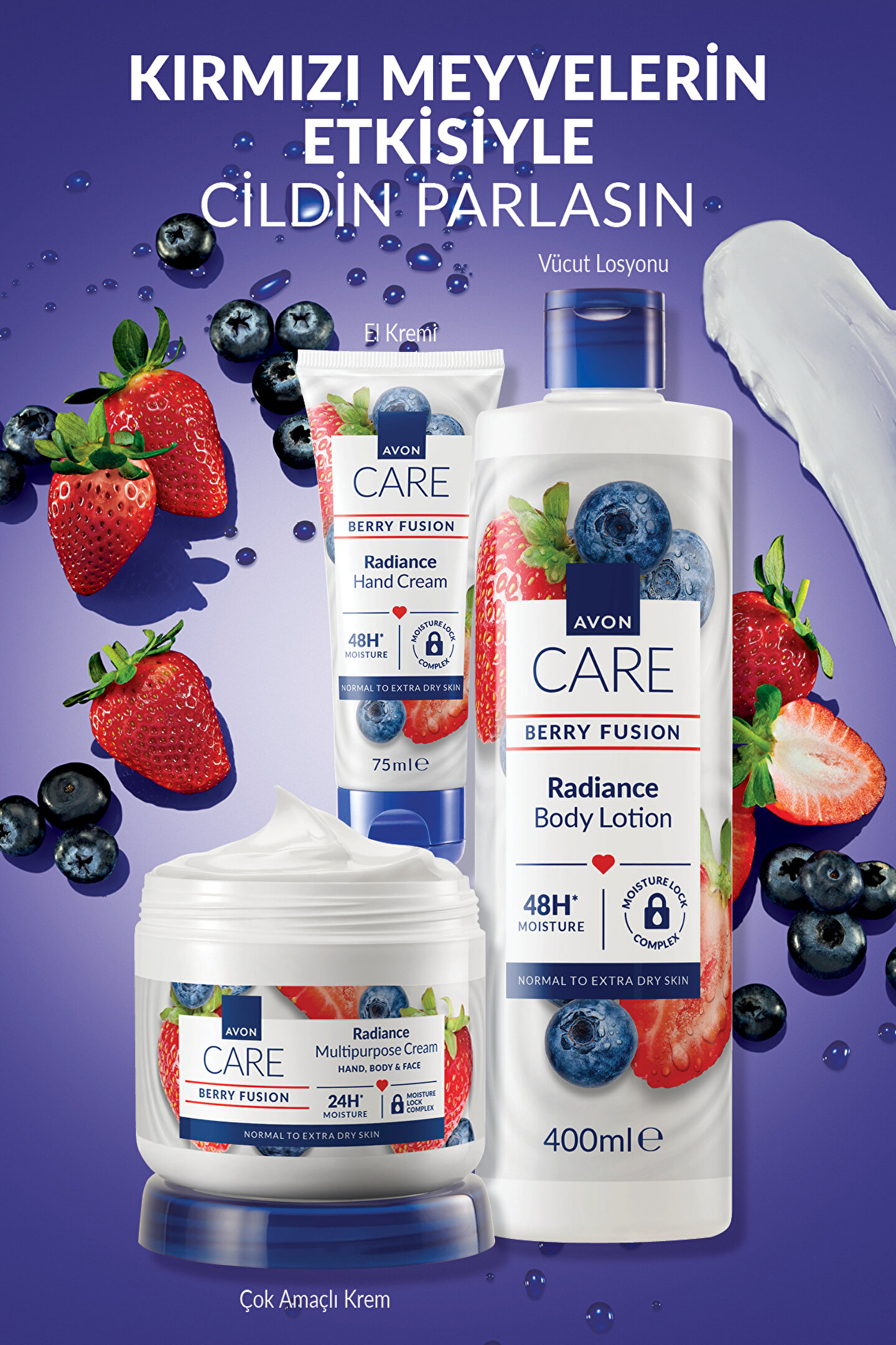 ÜRÜN KODU : KREM2661 ÖZELLİKLER : Yoğun bir parlaklık artışı için yaban mersini ve çilek ile zenginleştirilmiş, ışıltılı Berry Fusion Vücut Losyonumuzla cildinizi en iyi şekilde ortaya çıkarın. ; Tüm aile için uygun olan bu ürün, cildi 48 saat nem* ile ıslatarak yumuşak, pürüzsüz ve taze meyve kokusuyla beslenmiş bir his bırakmasını sağlar. ; Ayrıca yumuşak formül hızla emilir, böylece kurumasını beklemenize gerek kalmaz.*Birden fazla uygulamadan sonra. ; 30 katılımcıyla yapılan klinik etkililik çalışmasına dayanmaktadır. ; • Yaban mersini ve çilek özleri ve E vitamini ile formüle edilmiş vücut losyonu. ; • Dermatolojik olarak test edilmiştir ve normal ila ekstra kuru ciltler için uygundur. ; • Avon Care Berry Fusion koleksiyonunun bir parçasıdır. ; • Boyut: 400ml.;