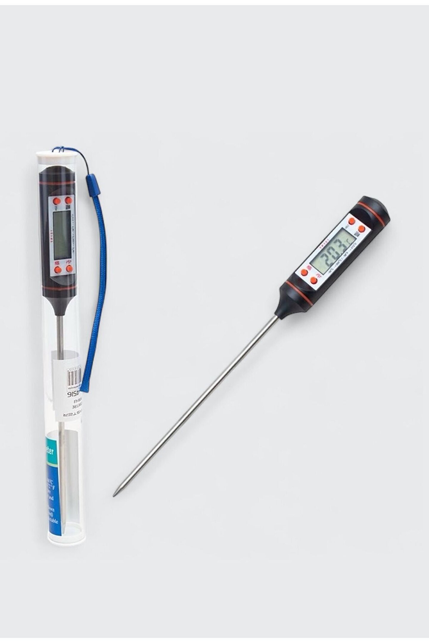 Cep tipi daldırmalı dijital termometre, geniş ölçüm aralığı ve hızlı tepki süresi ile mutfakta, laboratuvarda veya endüstriyel alanlarda güvenle kullanılabilir.; -50°C ile 300°C arasında sıcaklık ölçümü yapabilen cihaz, sadece 1 saniyede sonucu ekrana yansıtır.; °C ve °F ölçüm desteği sayesinde farklı kullanım ihtiyaçlarını karşılar.; Enerji tasarrufu için 10 dakika işlem yapılmadığında otomatik kapanma özelliğine sahiptir.; Kompakt yapısı ve paslanmaz çelik probu ile dayanıklı ve uzun ömürlüdür.; ⸻ ⚙️ Ürün Özellikleri: • Ölçüm Aralığı: -50°C ~ +300°C • Çözünürlük: 0.1°C • Doğruluk: ±1°C • Ölçüm Modu: °C ve °F • Ölçüm Hızı: 1 saniye • Sezici Tipi: K • Kalibrasyon: 0°C referans sıcaklık ile kendi kendini kalibre edebilir • Ekran: Dijital LCD ekran • Ekstra Özellik: Düşük pil uyarısı • Otomatik Kapanma: 10 dakika kullanılmadığında • Güç Kaynağı: 1 adet LR44 pil • Boyut: 260 x 20 x 15 mm • Kullanım Alanları: Mutfak, yiyecek kontrolü, içecekler, sıvılar, laboratuvar ve endüstriyel ölçümler