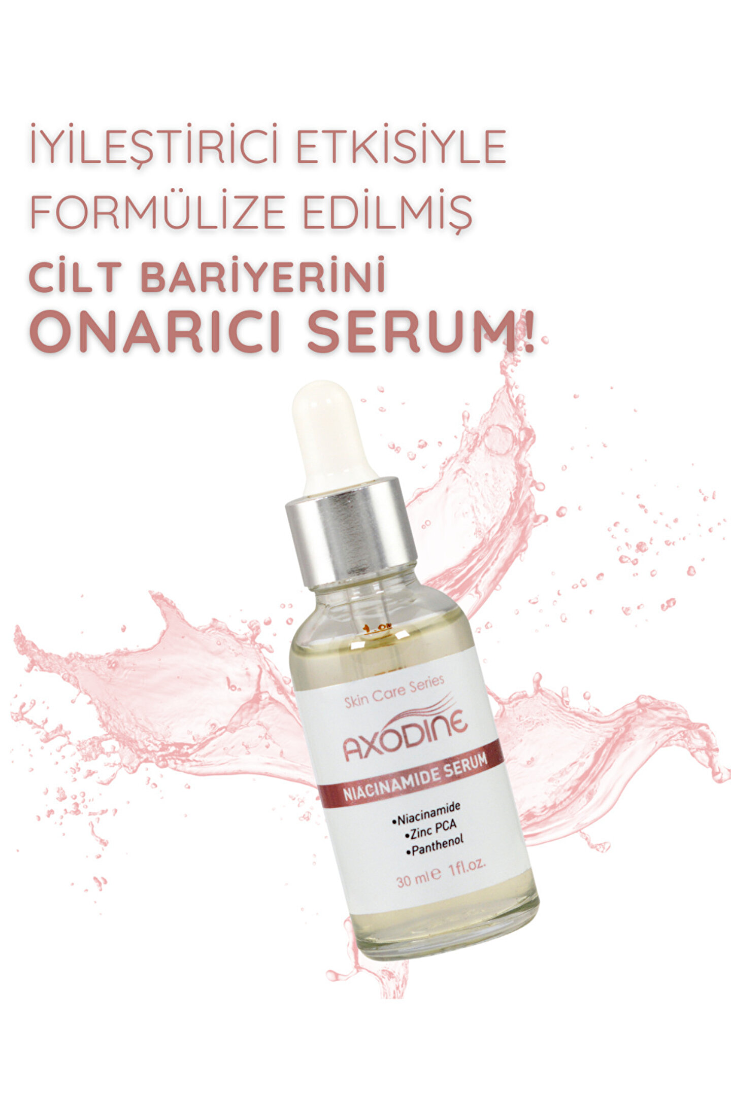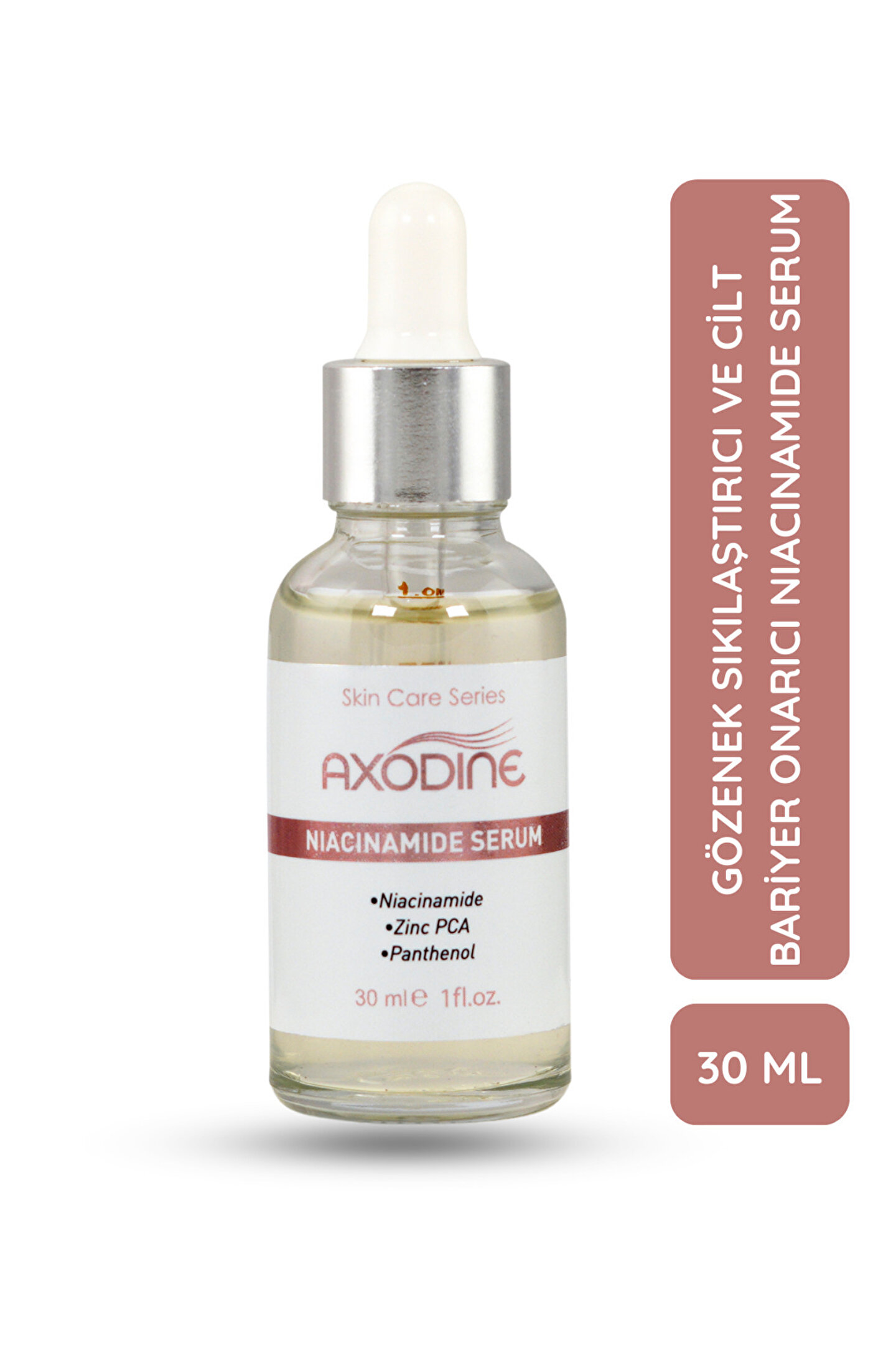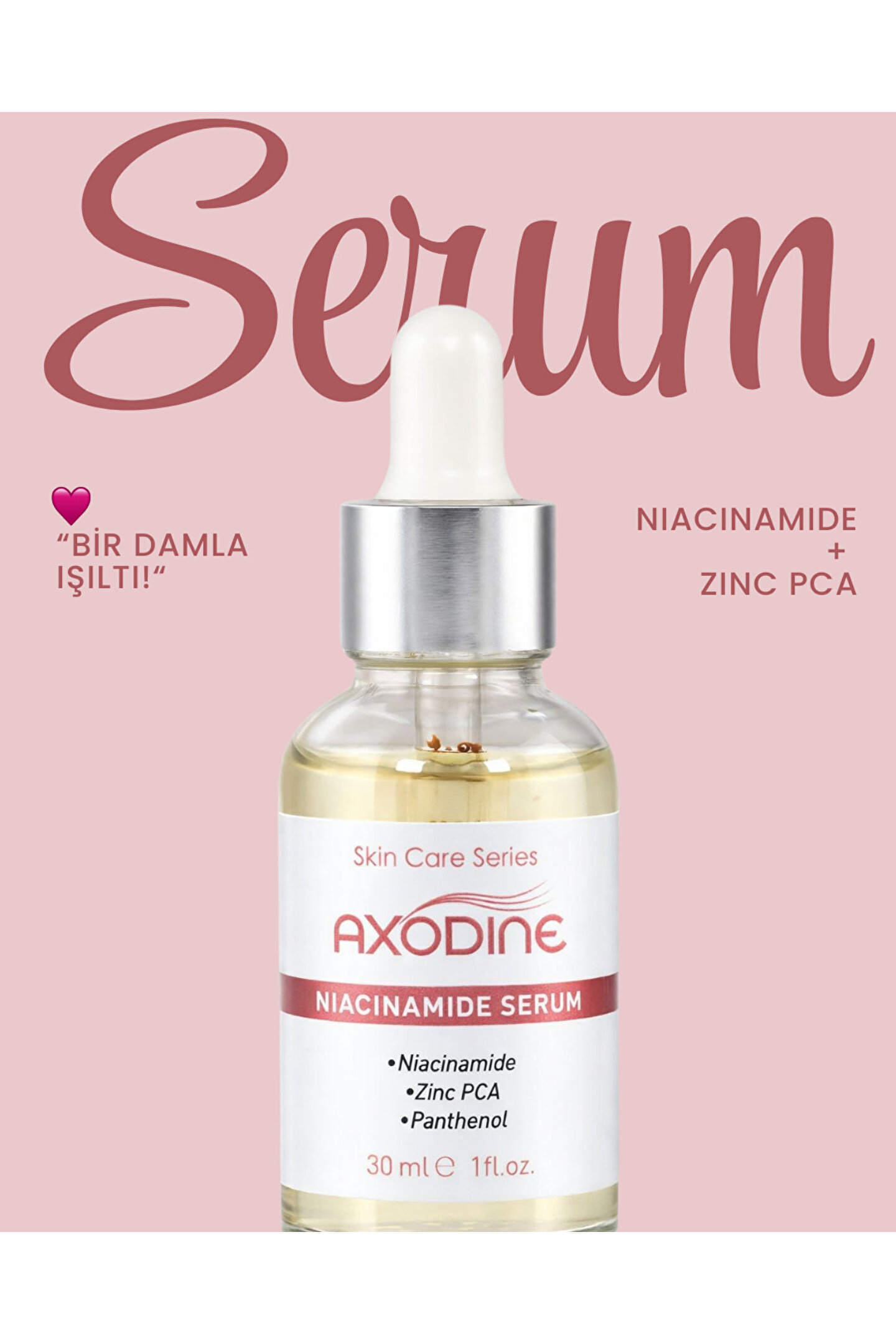 Gözenek, Sivilce Ve Siyah Nokta Karışıtı Niacinamide Serum 30 ML Lekeler, genişlemiş gözenekler ve eşit olmayan cilt tonlarıyla mücadele etmek için özel olarak formüle edilmiş etkili bir cilt bakım serumudur.; İçeriğinde bulunan Niacinamide sayesinde cilt tonunu dengelemeye ve pürüzsüz görünmesine yardımcı olur.; Cildin doğal yağ dengesini bozmadan cildinizi besler ve nemlendirme sağlar.; Düzenli kullanım ile cildinizin aydınlık bir görüntü kazanmasına da yardımcı olur.; NASIL KULLANILIR ; Günde 1 veya 2 kez cilt temizlendikten sonra avuç içerisine 5-6 damla alarak parmak uçlarınızla ; Yüz , boyun ve dekolte bölgesine , yukarıya doğru dairesel hareketler ile uygulayınız.; Uyguladıktan sonra Axodine gündüz bakım ya da gece bakım kremimizle uyguladığınız bölgeyi nemlendirebilirsiniz.; UYARILAR ; Harici kullanım içindir.; Çocukların ulaşamayacağı yerde ve oda sıcaklığında muhafaza ediniz.; Maddelerden herhangi birine karşı alerji gelişirse kullanımı durdurunuz.; Bütünlüğü bozulmuş açık yara üzerinde kullanmayınız.; Gözle temasından kaçınınız , temas halinde bol suyla yıkayınız.; İÇERİK ; Aqua, Niacinamide, Zinc PCA, Phenoxyethanol, Carbomer, Triethanolamine, Glycerin, Propylene Glycol, Panthenol, Ethylhexylglycerin.; ETKEN MADDELER ; Panthenol (B5 Vitamini) : Cildi derinlemesine nemlendirme özelliğine sahiptir.; Epidermal su kaybını önleme yeteneği vardır.; Hasarlı cilt hücrelerinin onarılmasında etkilidir.; Zinc PCA (Çinko) : Cildin nem ve enerji metabolizmalarında görev alarak cildin yenilenmesinde etkilidir.; İçeriğinin yapısı sayesinde aknelerin sebep olduğu lekelerin giderilmesini sağlar.; Yağlı cilt problemine sebep olan sebum üretimini azaltır.; Yağ bezesi oluşumlarının önüne geçmeye yardımcı olur ve cilt için doğal nemlendirme sağlar.; Niacinamide : Cilt bariyerinin güçlendirilmesinde, sebum salgısının dengelenmesinde ve cildin yenilenmesinde etkilidir.; Ciltteki ince çizgilerin azalmasını sağlar.; Cildi düzenleyerek yeni leke oluşumuna engel olur.; Akneli cildi sakinleştirirken ; kızarıklığın giderilmesine yardımcı olur.; Niacinamide , B5Vitamini, E Vitamini ile zenginleştirilmiş formül.; Not : Üretici firma olarak, ürünlerimizin Sağlık Bakanlığı izin ve bildirimleri, alerjen testleri, raporları ve diğer belgeleri mevcuttur.; MARKAMIZ: Axodine Niacinamide Serum'da bu değerli yağ ve vitaminleri özenle kullanarak cildinize faydasını düzenli kullanımda kısa sürede hissedeceğinizi düşünüyoruz.; Ürünümüz Paraben/Sülfat içermez, yapışkanlık veya yağlılık hissi bırakmaz.