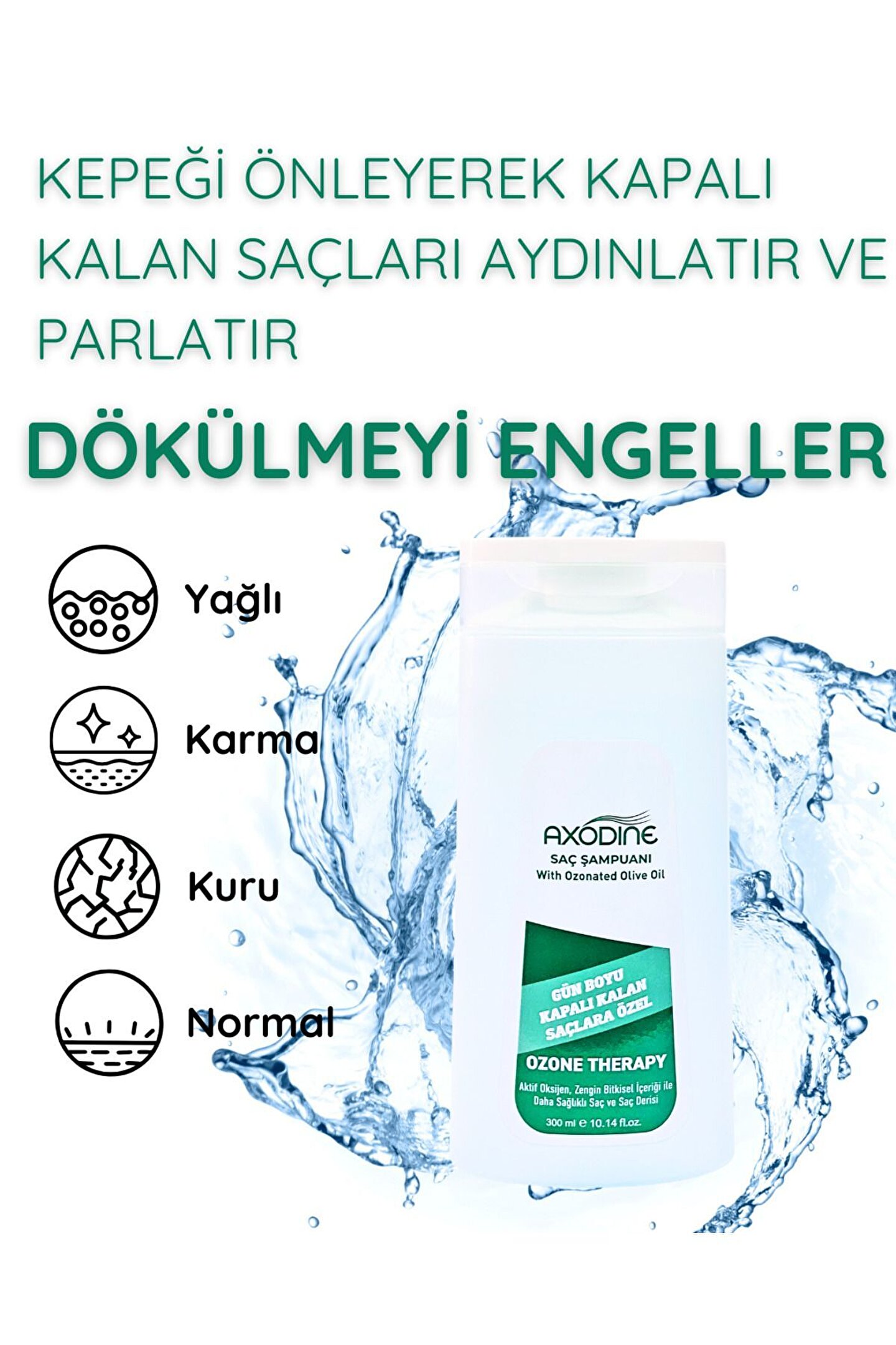 Axodine Kapalı Saçlara Özel Ozon Şampuan – Ferahlatıcı ve Arındırıcı Bakım 300 ml Axodine Kapalı Saçlara Özel Ozon Şampuan, saç ve saç derisini derinlemesine arındırmak, ferahlatmak ve gün boyu temiz his sağlamak için geliştirilmiş özel bir formüldür.; Kapalı saçlarda sık görülen hava alamama, yağlanma, ve kötü koku problemlerine karşı etkili bir bakım sunar.; Saç tellerini güçlendirir, saç derisini dengeler.; Ozon desteğiyle zenginleştirilmiş içeriği, saç derisindeki gözenekleri arındırarak ferahlık sağlar.; Saç köklerini besler, saç tellerini yumuşatarak kolay tarama imkânı sunar.; Kapalı saç kullananların günlük bakım rutininde güvenle tercih edebileceği şekilde geliştirilmiştir.; İhtiyaç duyan herkesin kullanabileceği şekilde formüle edilmiştir.; Kullanım Talimatı: Islak saça masaj yaparak uygulayın, köpürttükten sonra durulayın.; İhtiyaç halinde tekrarlayın.; Günlük kullanıma uygundur.; Düzenli kullanımda saç telleri güçlenir, saç derisi daha dengeli bir yapıya kavuşur ve saçın canlılığı artar.; Öne Çıkan Özellikler: