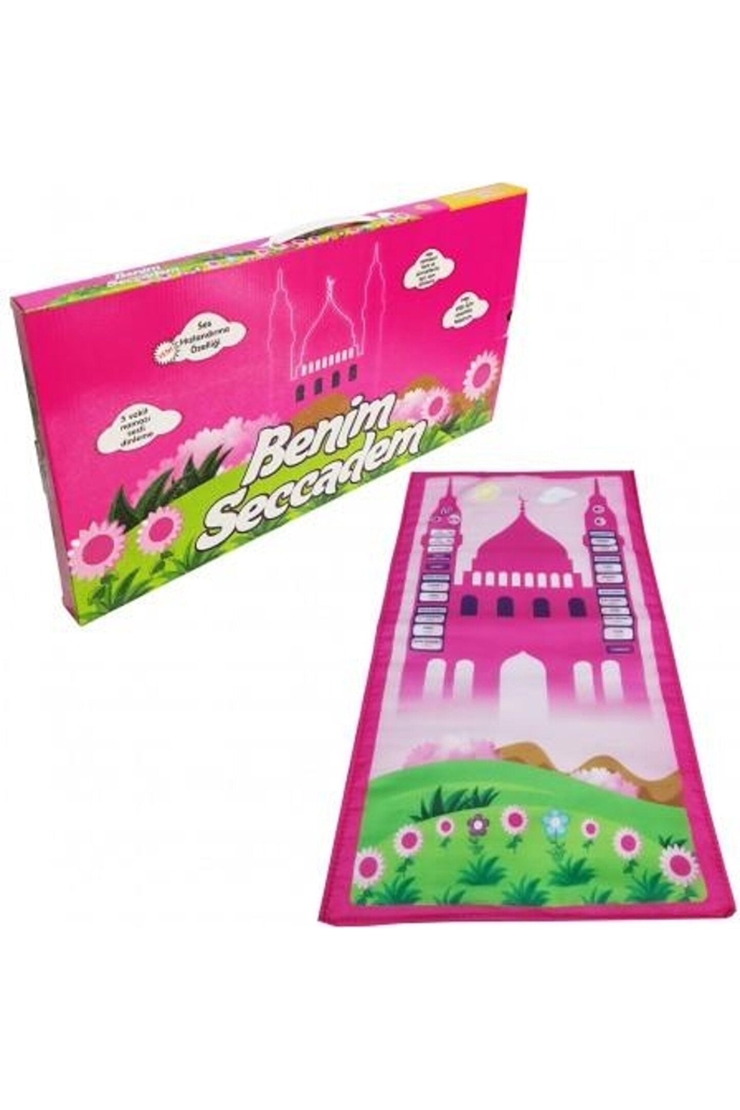 508P - Benim Seccadem - Çocuklar İçin Sesli Konuşan Namaz Kıldıran Seccade Kod: AYFA508-P Rabbimizin emri olan namazı çocuklarımızın namazlarını kılmaya alışmalarında ve ilk öğrenme aşamalarında eksiksiz ve en doğru şekilde namazlarını kılmalarını kılmayı öğrenmeleri için hazırlanmış bu eşsiz ürün ile çocuklarınız namaz kılmayı eğlenerek öğrensin. ; PAKET İÇERİĞİ: 1 Adet Benim Seccadem Sesli Eğitici Çocuk Seccadesi İLK SECCADEM ÇOCUKLAR İÇİN NAMAZ KILMAYI ÖĞRETEN SECCADE TEKNİK ÖZELLİKLERİ: Benim Seccadem iç kısmı naylon, ses boardı ve elektrik devreleri içerir, sudan ve ateşten uzak tutulmalıdır. ; Ses boardının içi sadece yalnızca profesyonel teknisyenler tarafından açılmalıdır. ; Ürünü kullanırken, en iyi performans ve ses kalitesi alabilmek için, ürünü düz bir yüzeyde ve katlamadan kullanın. ; İlk Seccademi temizlemek isterseniz hafif nemli bir bezle siliniz. ; Kesinlikle suya temas ettirmeyiniz ve çamaşır makinasın da yıkamayınız KULLANIMI: 3 Adet AAA pil ile çalışır. ; Piller paket içeriğine dahil değildir. ; Üzerinde bulunan görseller dokunmatik sistemlidir. ; Dilediğiniz dua veya namaz görseline dokunarak başlatabilirsiniz. ; Ses yüksekliği ayarı ve durdurma özelliğine de sahiptir. ; ÜRÜN BOYUTU: 88 Cm x 52 Cm Not: Garanti süresi, ürünün teslim tarihinden itibaren başlar. ; Ürün 1 yıl garantilidir. ; Teslimat Bilgileri Kargonuz teslim edildiğinde, ürünün paketinde deformasyon veya ürüne zarar verebilecek bir durum söz konusu ise, kargo görevlisi ile birlikte paketi açarak ürünlerinizin durumunu kontrol ediniz. ; Ürünlerinizde bir hasar gördüğünüz takdirde, kargo yetkilisinden tutanak tutmasını isteyiniz ve paketi teslim almayınız. ; Tutanak tutulan ürünler kargo firması tarafından bize ulaştırılacak ve ürünlerin değişimi yapılacaktır. ; 0 332 350 07 06 numaraya bilgi verilmesi gerekmektedir.;