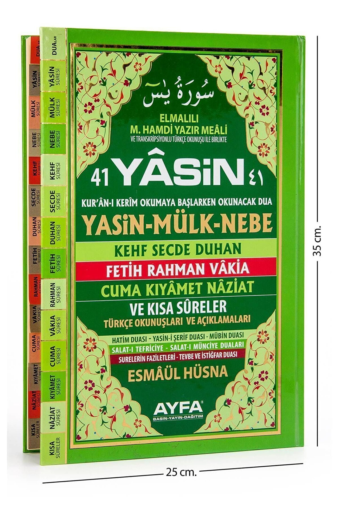 Vefat, Doğum ve Her Türlü Cemiyetlerinizde Dağıtabileceğiniz Yasin Kitapları Hem Hayrınıza Vesile Hemde Sevdiklerinize Güzel Bir Hediye Olacaktır.; Yasin Kitabı Özellikleri: Elmalılı M.; Hamdi Yazır Meâli ve Transkripsiyonlu Türkçe Okunuşu ile Birlikte; Okuması Çok Kolay Bilgisayar Hatlı; Cami Boy - 25 x 35 cm Ebat; 2 Renk Ofset Baskı; 1. Kalite Şamua Kağıt; Lüks Ciltli Sert Kapak; Fihristli; 128 Sayfa; Varak Yaldız Baskılı; 714 gr.; Yasin Kitabı İçeriği: Kur'an-ı Kerîm Okumaya Başlarken Okunacak Dua; Yâsin; Fatiha; Elif Lam Mim; Ayet-el Kursi; Amenerrasûlü; Mülk; Nebe; Kehf; Secde; Duhan; Fetih; Rahman; Vakıa; Cuma; Kıyâmet; Nâziat; Kısa Sûreler; Salaât-ı Tefriciye Duası; Salât-ı Münciye Duası; Hatim Duası; Yasin-i Şerif Duası; Mübin Duası; Surelerin Faziletleri; Tevbe ve İstiğfar Duası; Esmâül Hüsna; Örnek Etiket Yazıları: Mehmet Yıldız Ruhuna Fatiha 08.11.2020; Hoşgeldin Duru Bebek; Eymen’in Bebek Mevlidi; Ömer’in Sünnet Hatırası 19.06.2021; Mevlüdümüz’e Hoşgeldiniz; Ecrin 3 Yaşında; Aramıza Hoşgeldin Betül; Kadir’in Sünnet Mevlüdü; İsmail Ege 20.12.2020 Teşekkür Ederiz; Yasemin’in Kınası 04.11.2020; Emir’in Sünnetine Hoşgeldiniz; Ayla’nın Söz Hatırası; Kınama Hoşgeldiniz; Söz Hatırası Ahmet ve Emine 20.01.2021; Not: Etiket firmamızın hediyesidir.; Etiketin üzerinde yazılı olmasını istediğiniz bilgileri siparişinizi verirken sipariş notu kısmına yazabilir ya da mesaj olarak iletebilirsiniz.