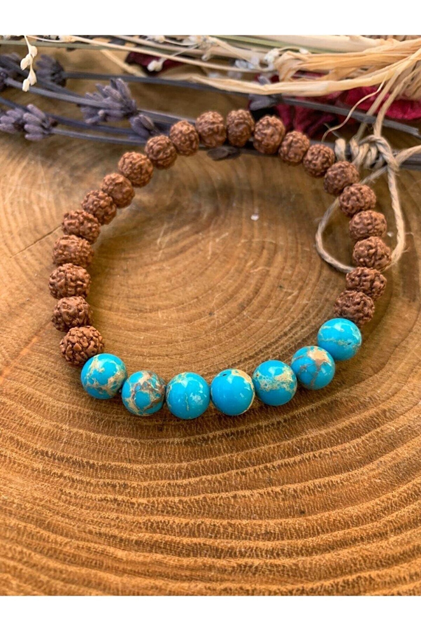 Doğal taş kullanımı sayesinde her bileklik benzersiz ve otantik bir görünüm sunar; Taş cinsi olarak Rudraksha ve varisit taşı tercih edilerek, bilekliğe eşsiz bir karakter kazandırılmıştır; Bu bileklik, hem şıklığı hem de doğallığı bir arada sunarak günlük kullanım için idealdir;