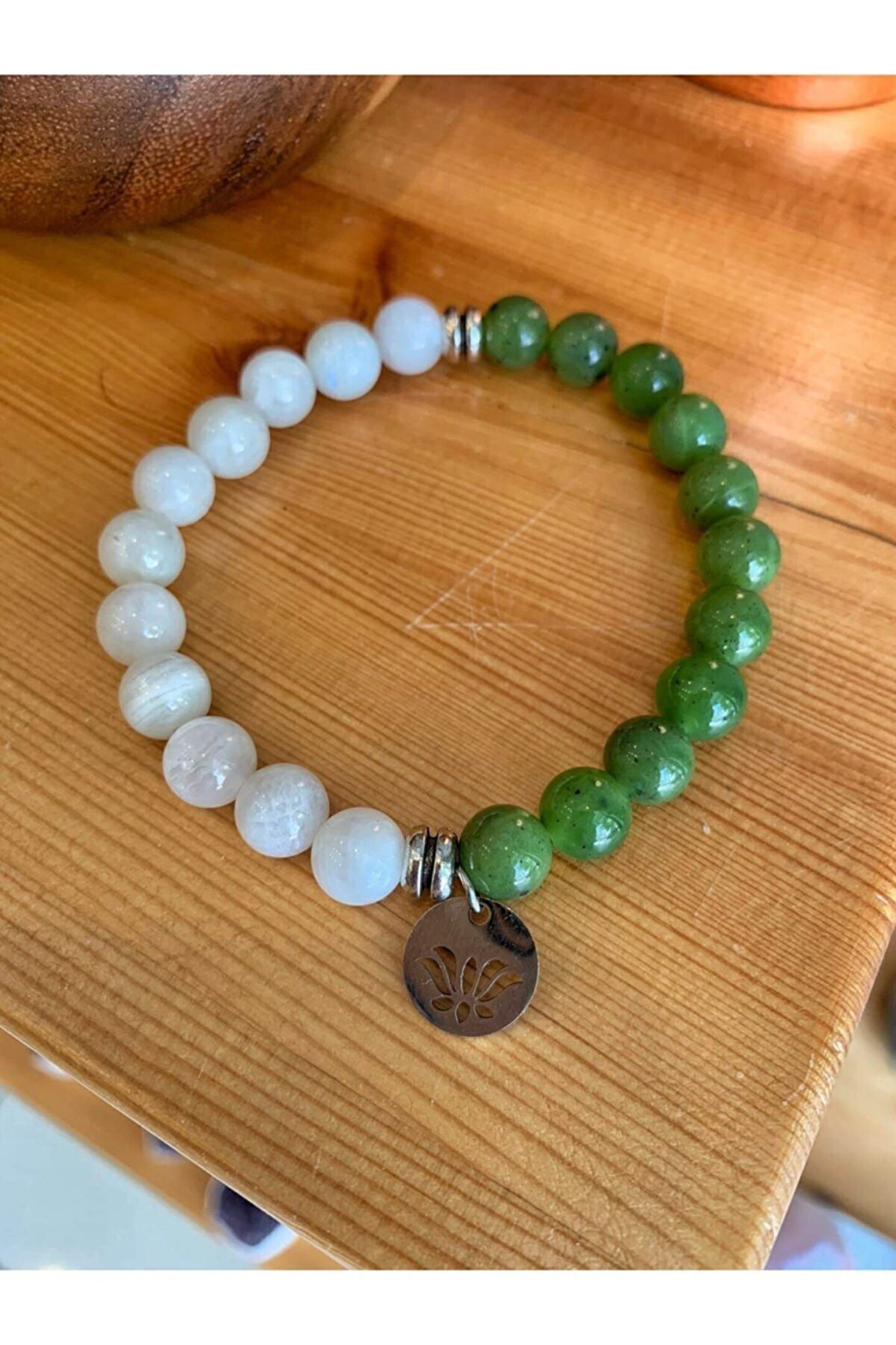 Doğal taş kullanımı sayesinde her bileklik benzersiz ve otantik bir görünüm sunar; Yeşim taşı ve ay taşı gibi değerli taşların birleşimi, zarif ve şık bir aksesuar deneyimi sağlar; Doğal taşların eşsiz dokusu ve renkleri, bilekliğe sofistike bir hava katar; Ay taşı detayı ile hem estetik hem de sembolik bir anlam taşıyan bu bileklik, özel günlerde tercih edilebilir;