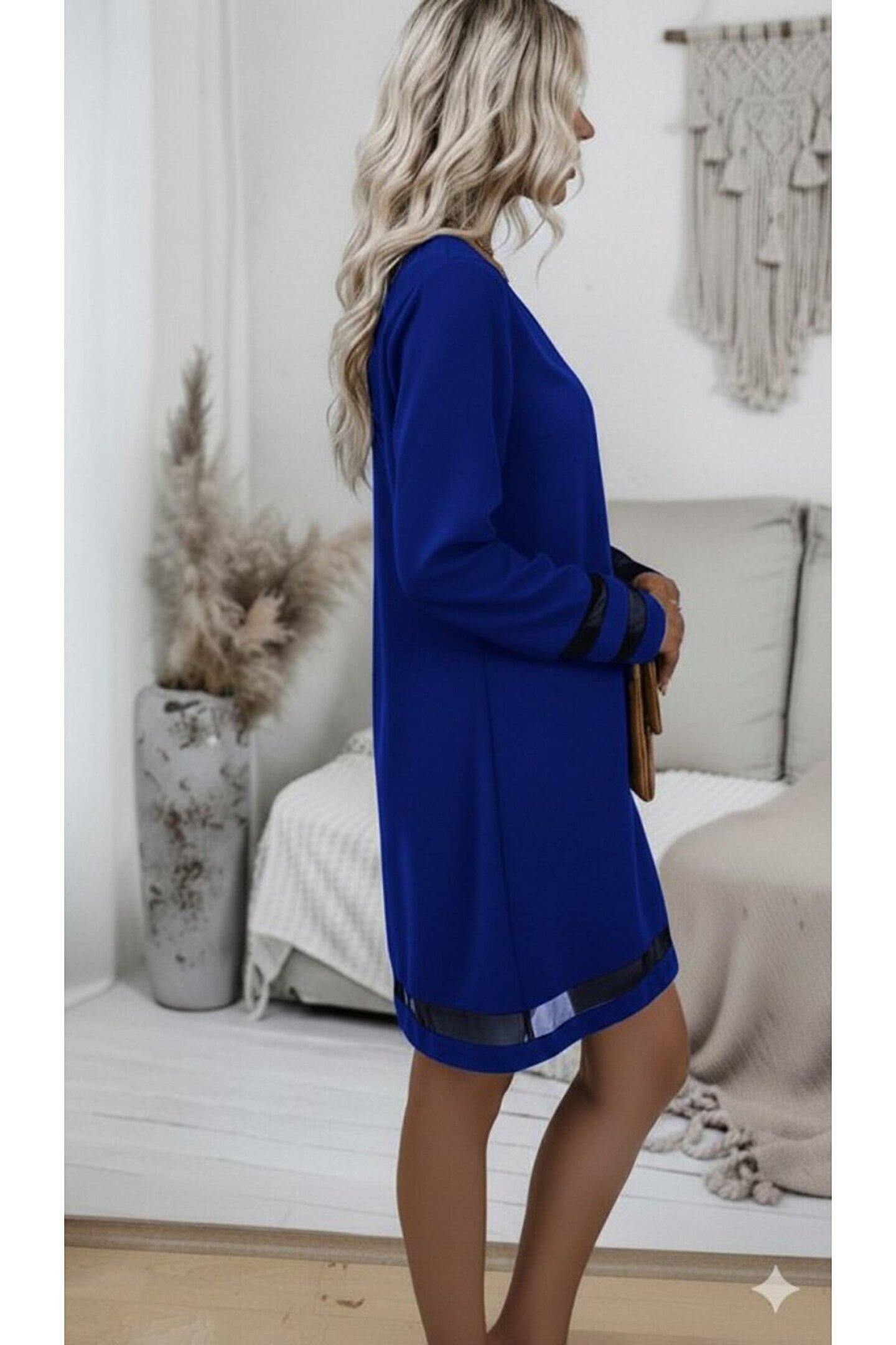 Kadın Uzun Kollu V Yakalı Tül şerit Detaylı Mini Krep Elbise