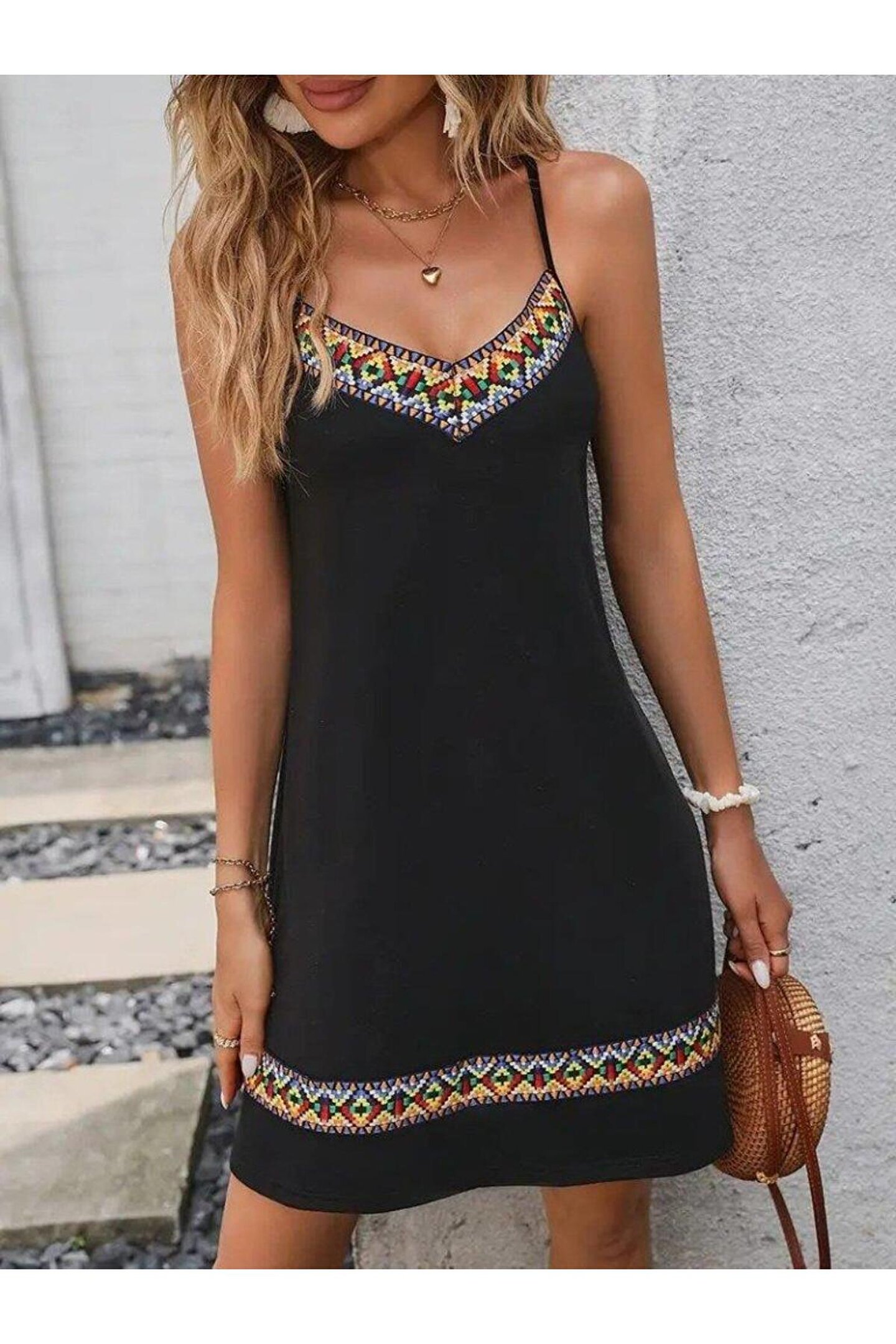babatr.com Kadın Ip Askılı V Yakalı Etnik Desenli Detaylı Elbise
