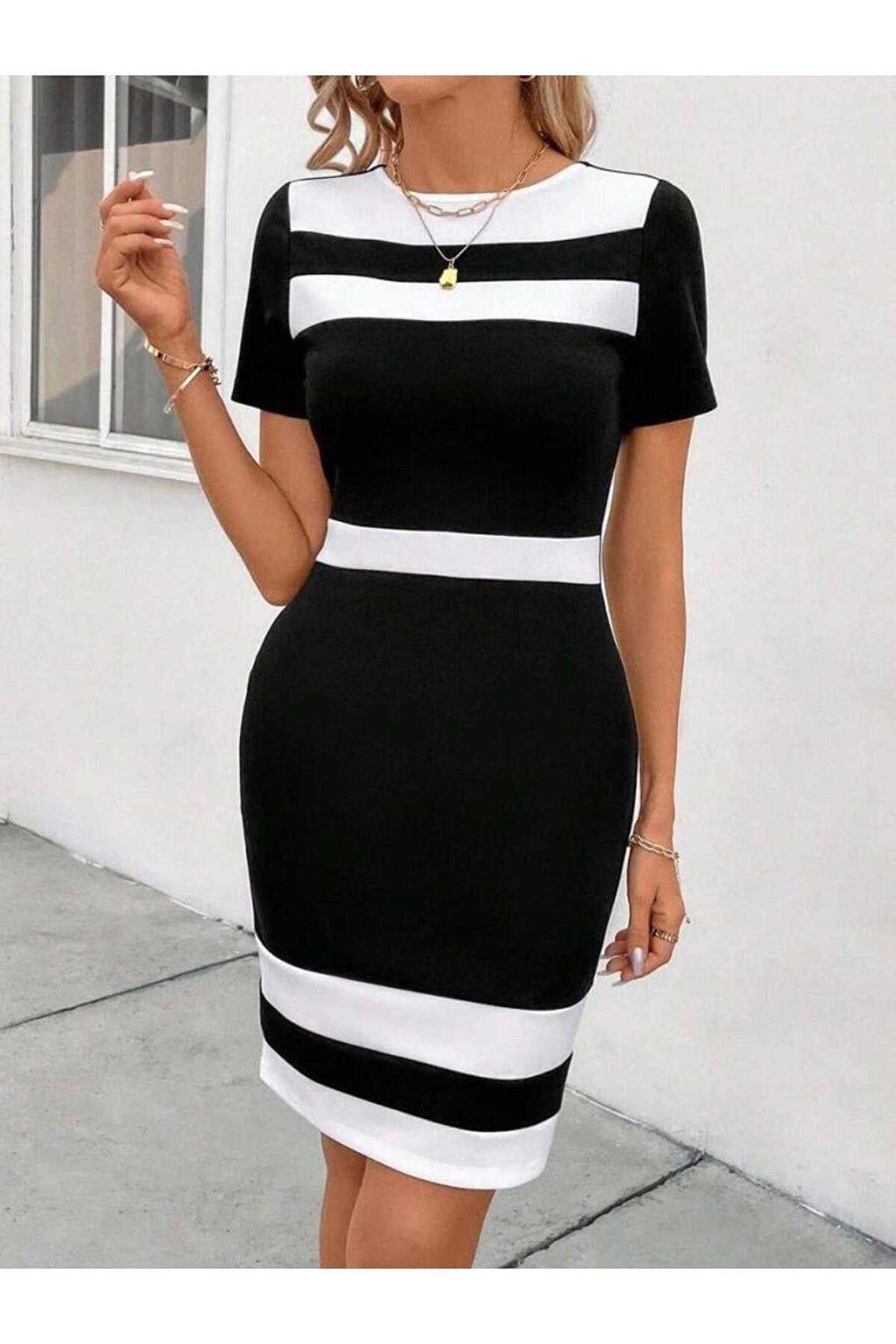 Kadın Kısa Kollu Bisiklet Yaka çift Renkli Ithal Krep Elbise