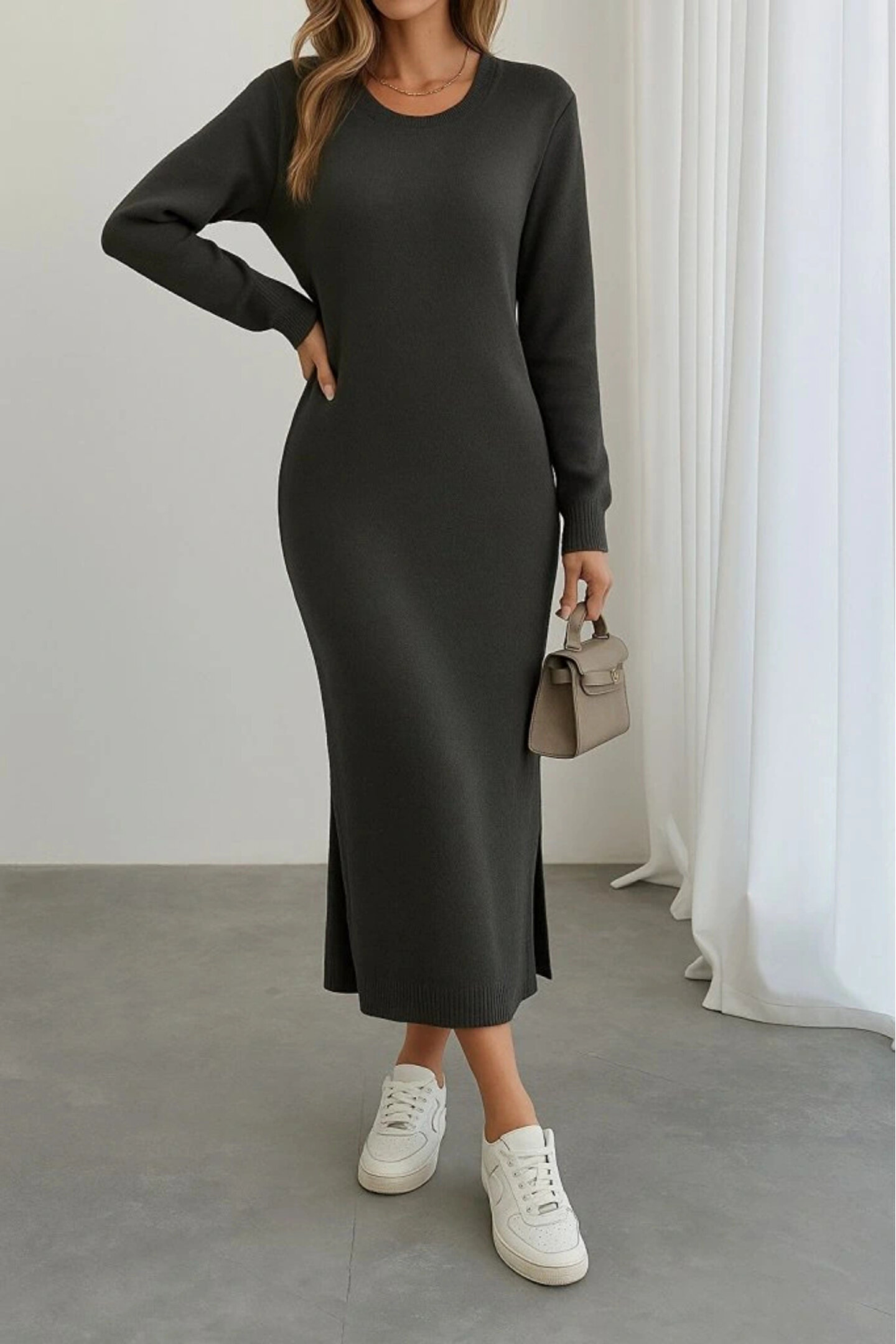 Kadın Uzun Kollu Bisiklet Yaka Yırtmaç Detay Triko Midi Boy Elbise