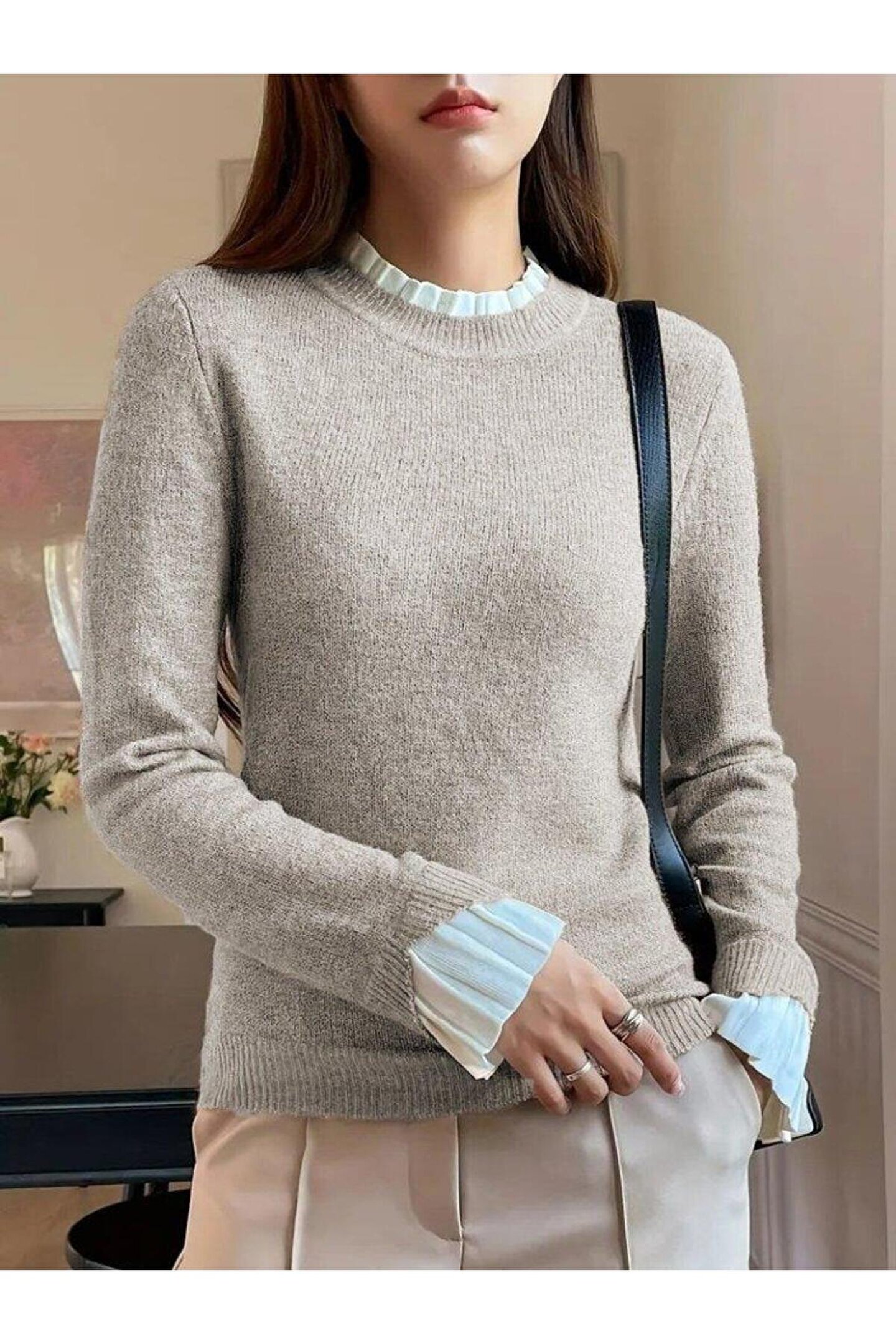 babatr.com Kadın Uzun Kollu Fırfırlı Yakalı Triko Krem Bluz
