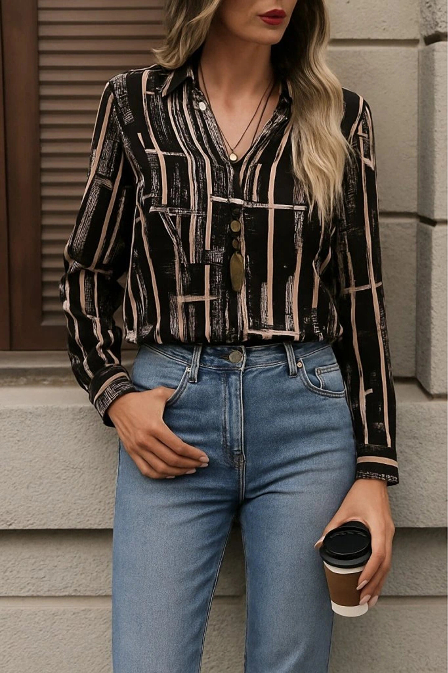 babatr.com Kadın Uzun Kollu V Yakalı Desenli Dalgıç Bluz