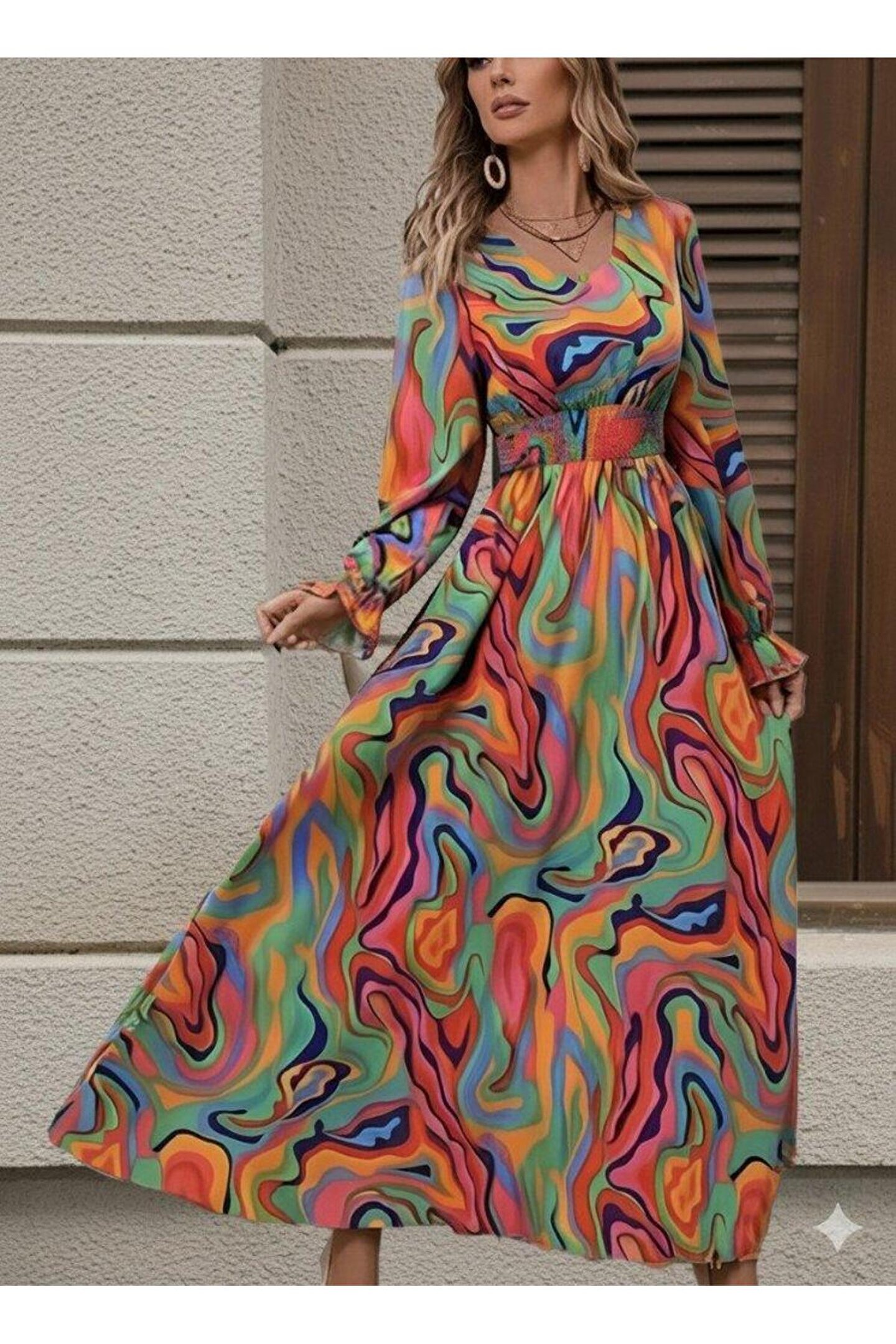 Kadın Uzun Kollu V Yakalı Desenli Maxi Süprem Elbise