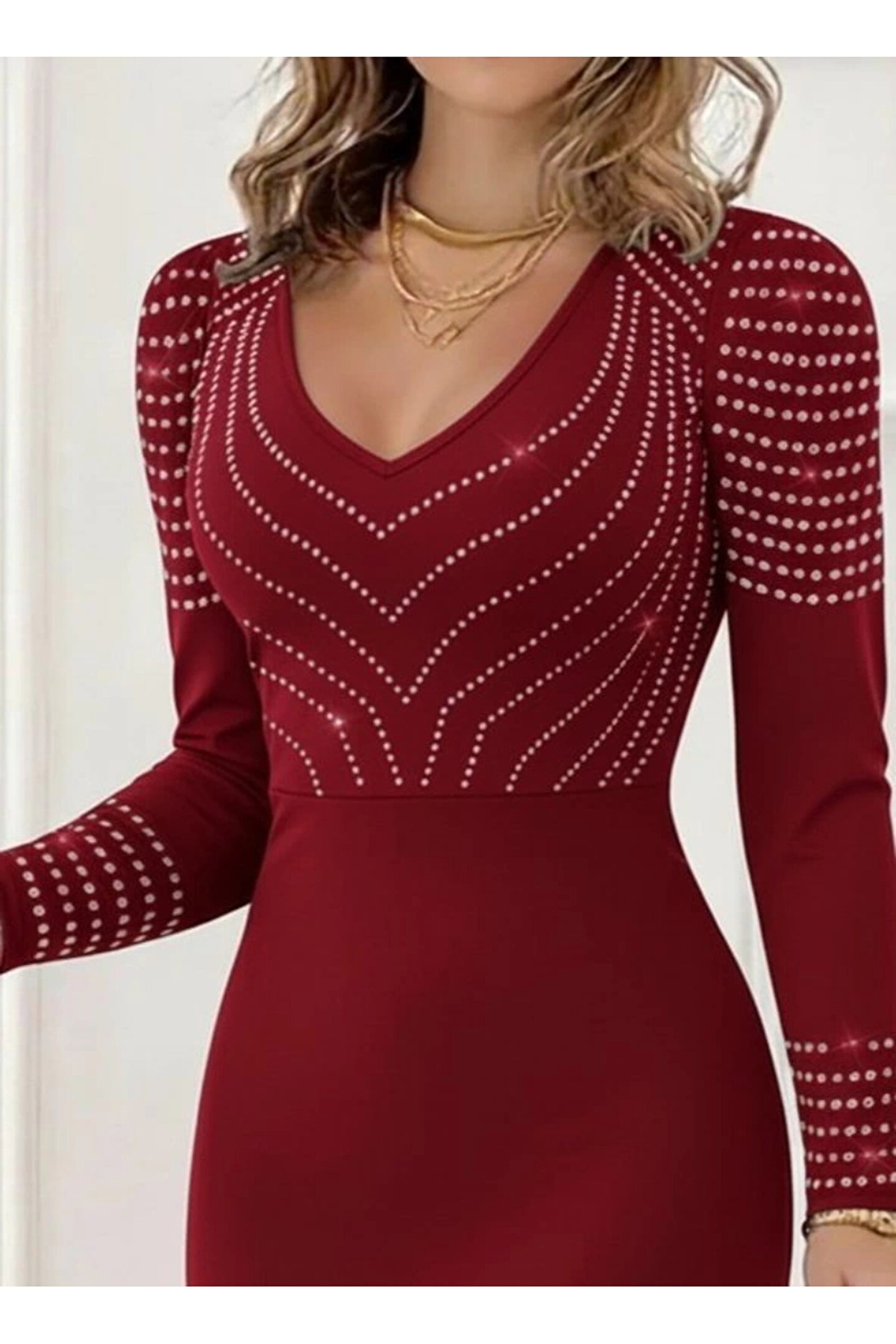 Kadın Uzun Kollu V Yakalı Taşlı Mini Ithal Krep Elbise