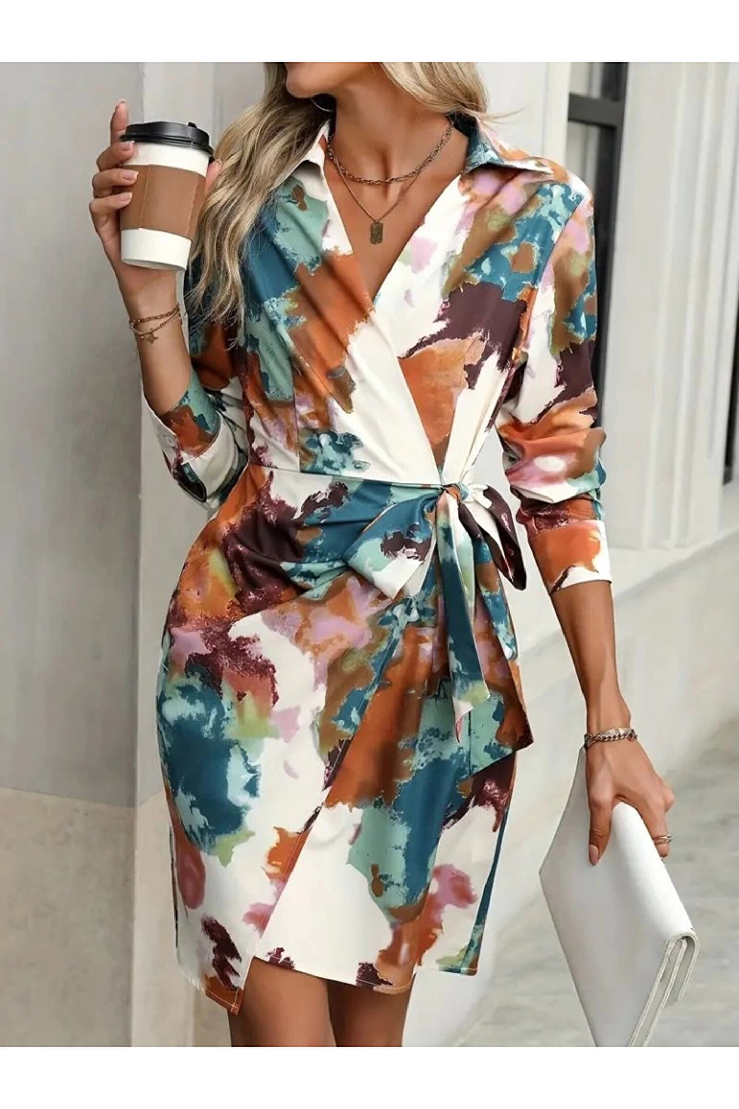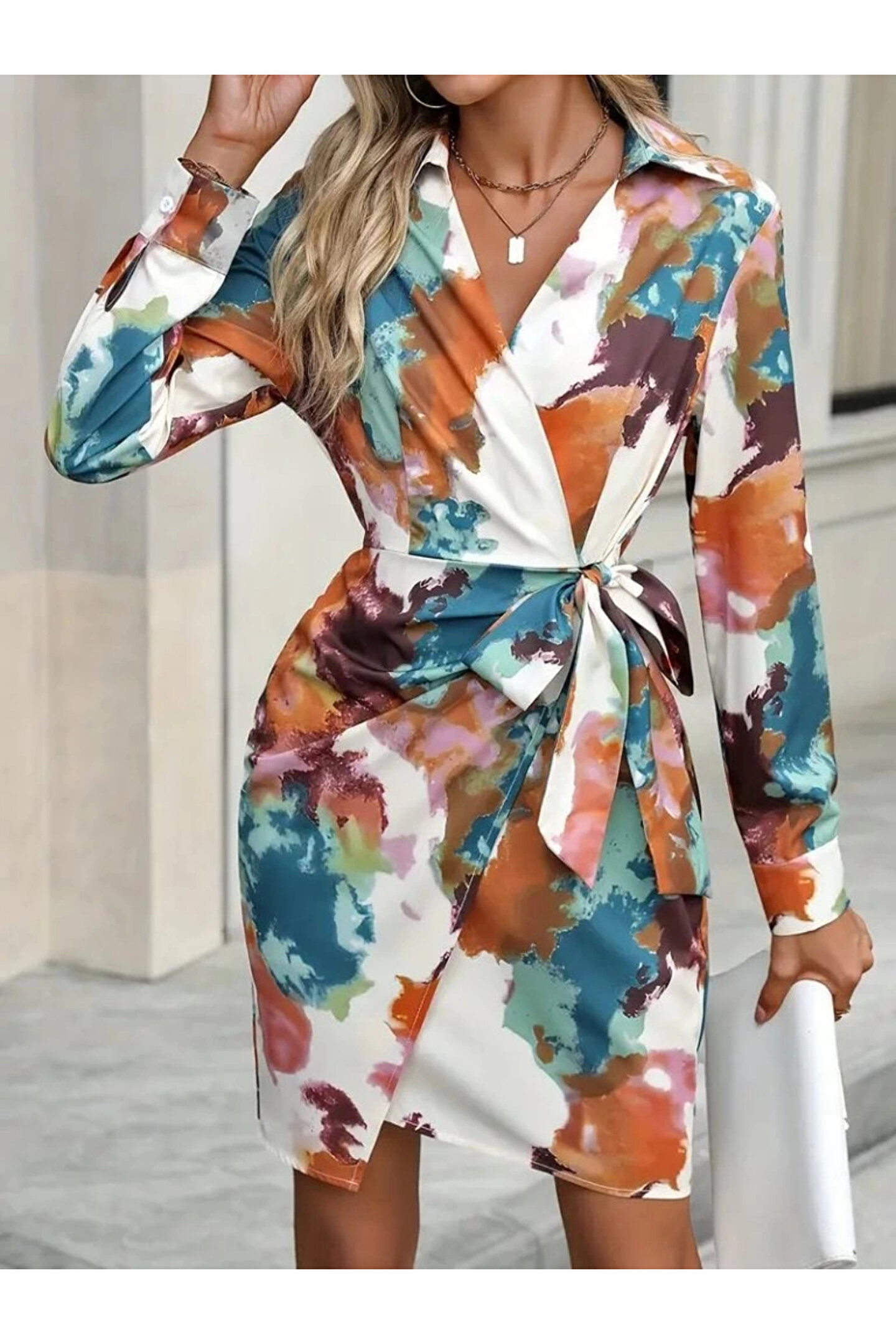 Kadın Uzun Kollu Yakalı Yandan Bağlamalı Mini Desenli Modal Elbise