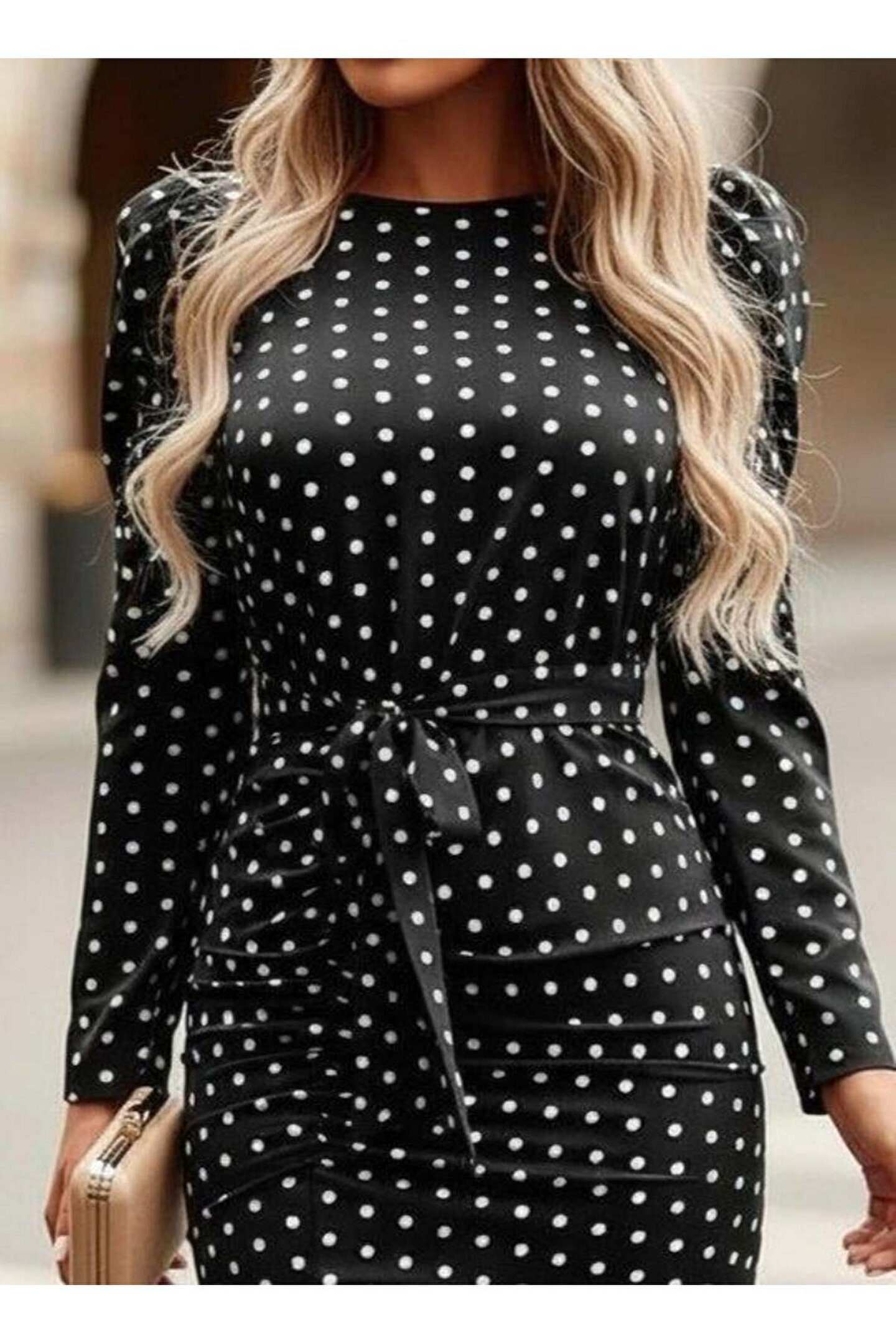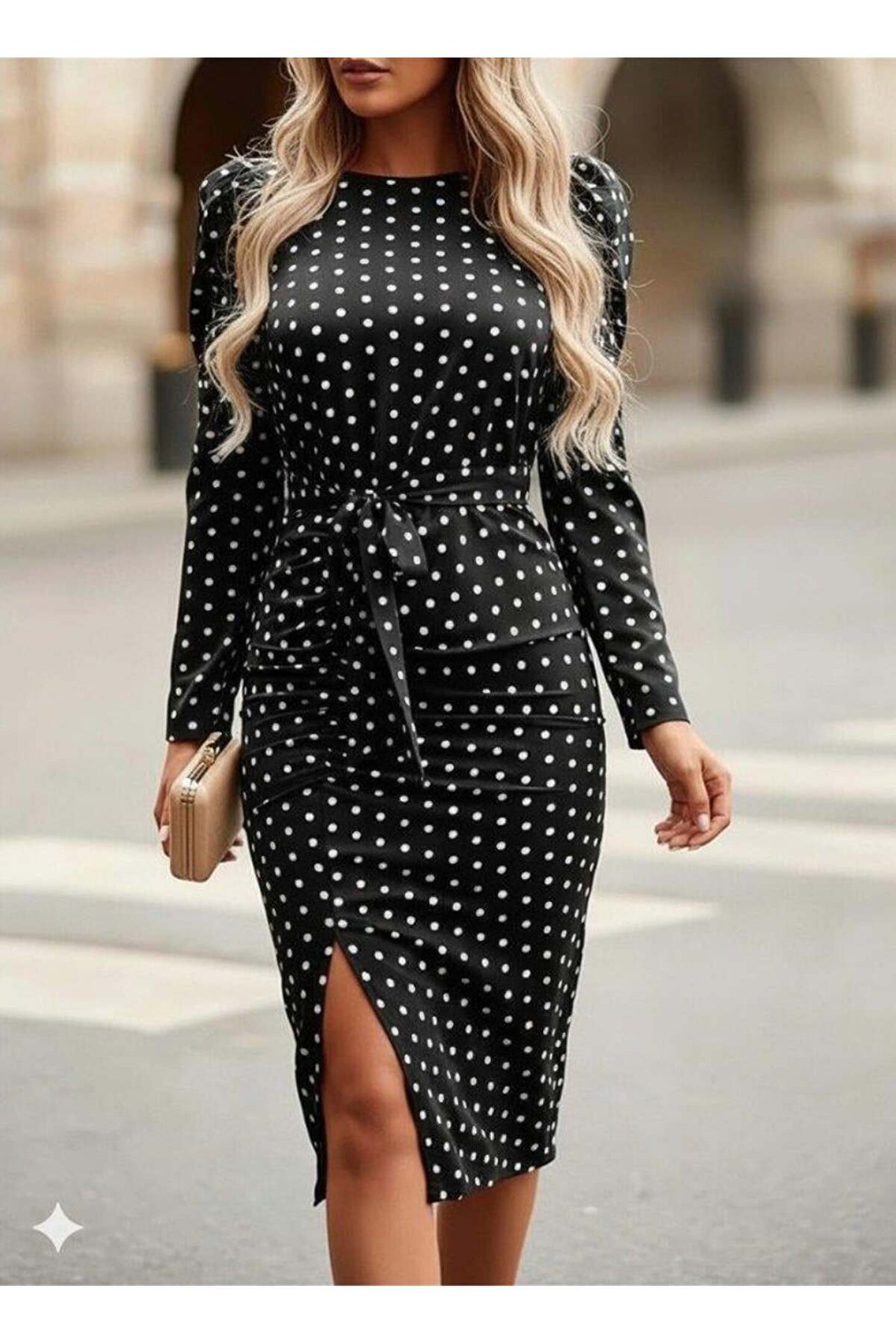 babatr.com Kadın Uzun Kollu Yuvarlak Yaka Belden Kuşaklı önden Yırtmaçlı örme Krep Elbise